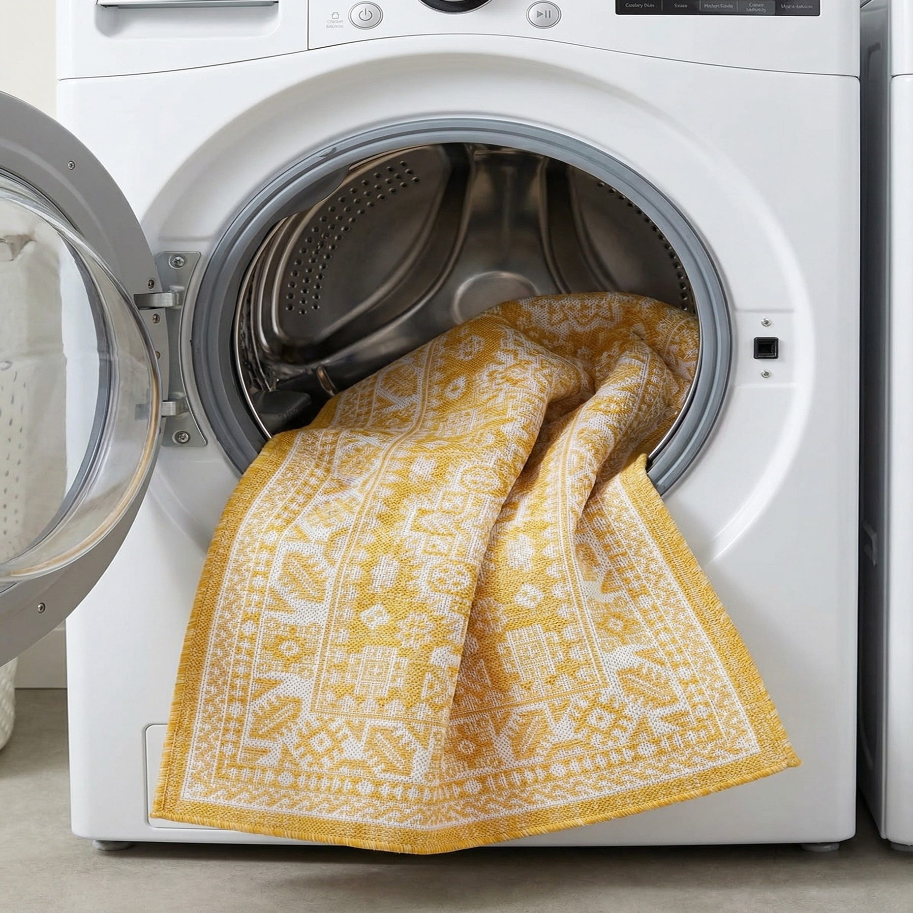 Primary color is Yellow. Colors in this rug include: Yellow, Ivory.