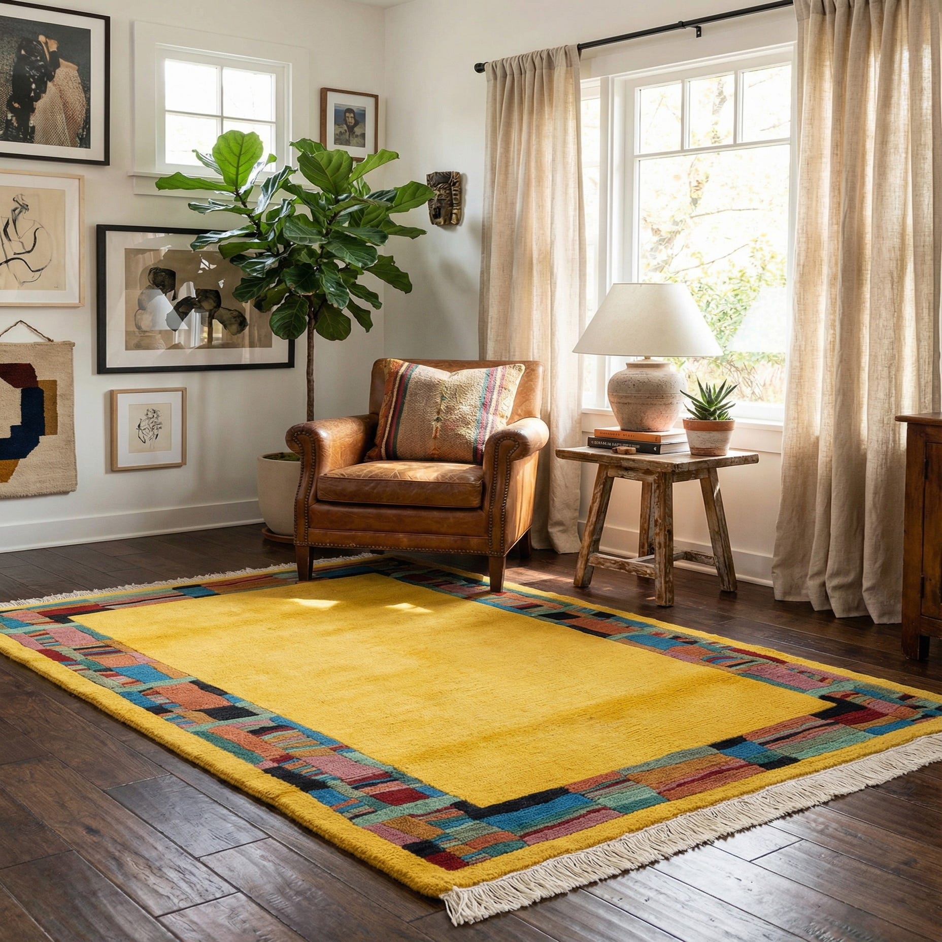 Primary color is Yellow. Colors in this rug include: Yellow, Beige, Black, Blue, Brown, Light Blue, Light Brown, Light Green, Red.