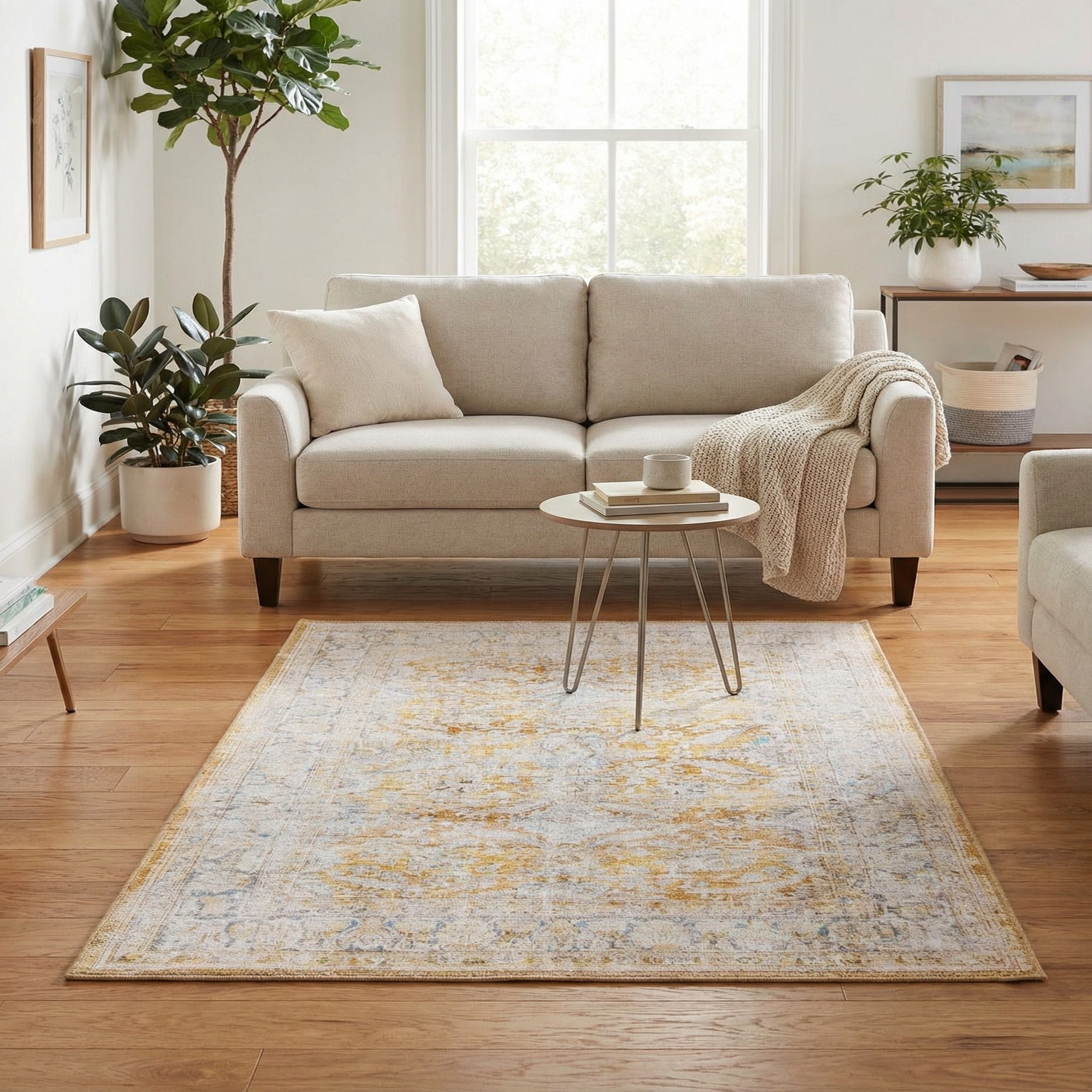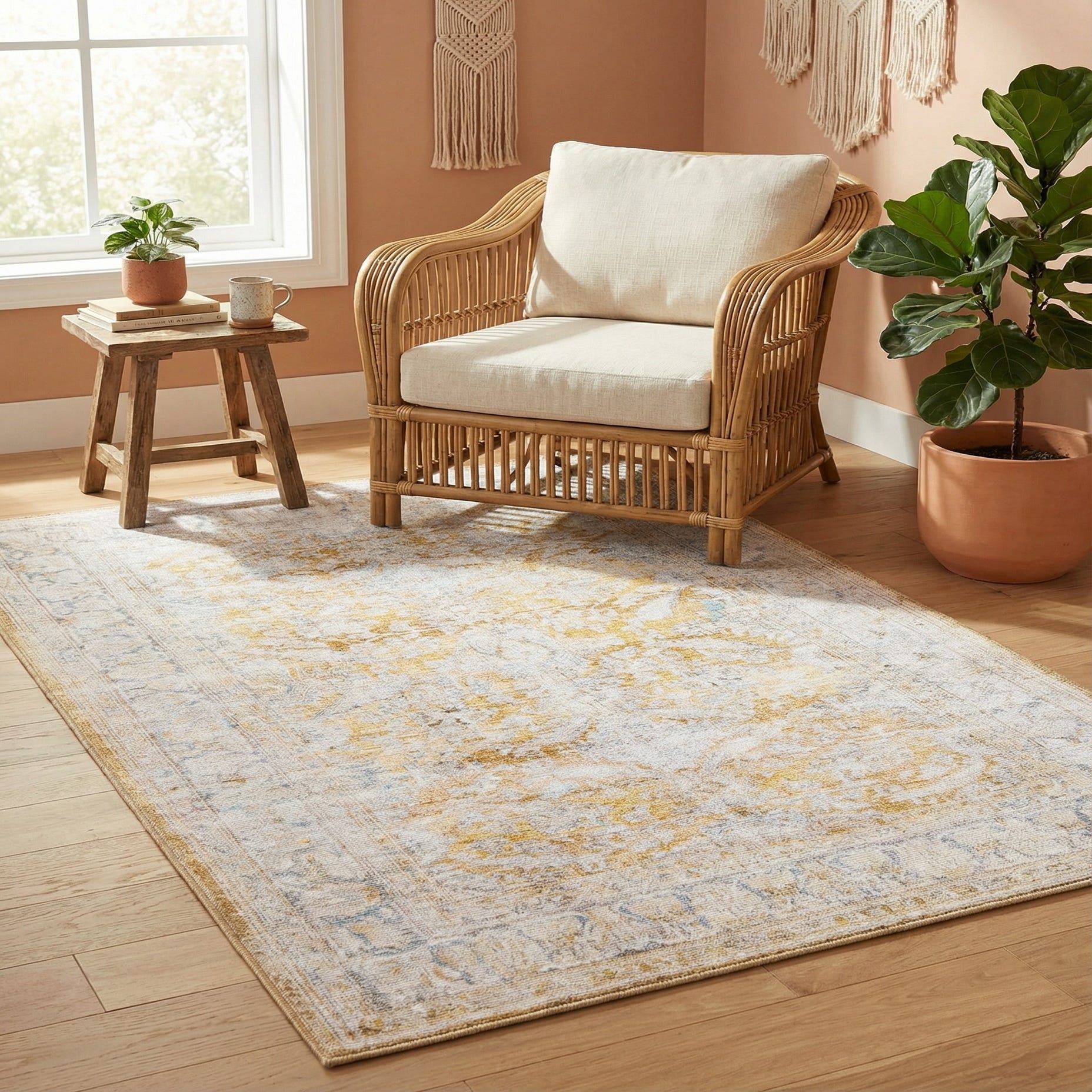 Primary color is Yellow. Colors in this rug include: Yellow, Ivory, Light Blue, Olive, Violet.