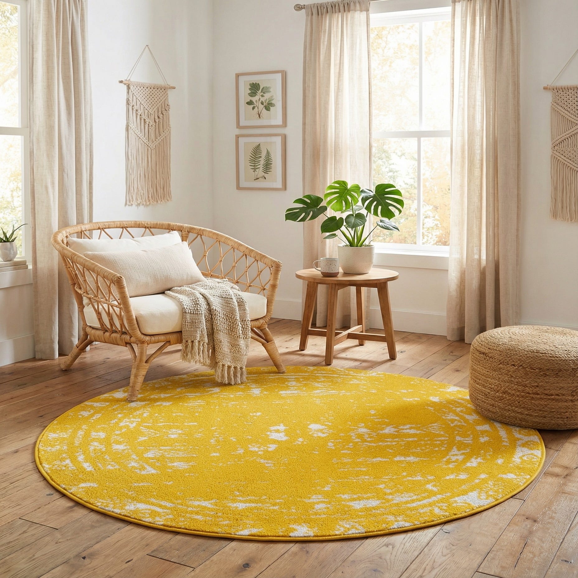 Primary color is Yellow. Colors in this rug include: Yellow, Ivory.