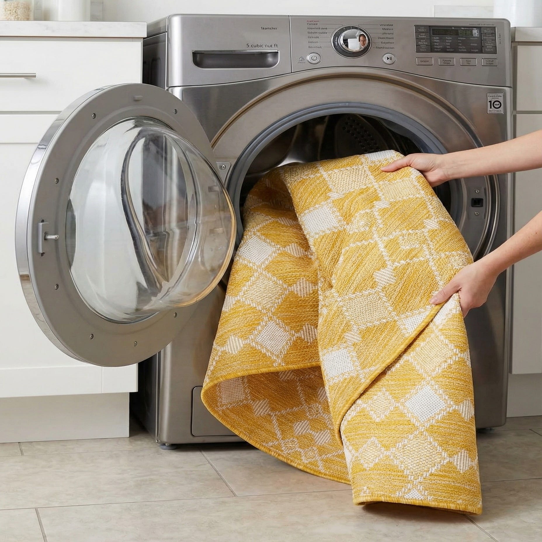Primary color is Yellow. Colors in this rug include: Yellow, Ivory.