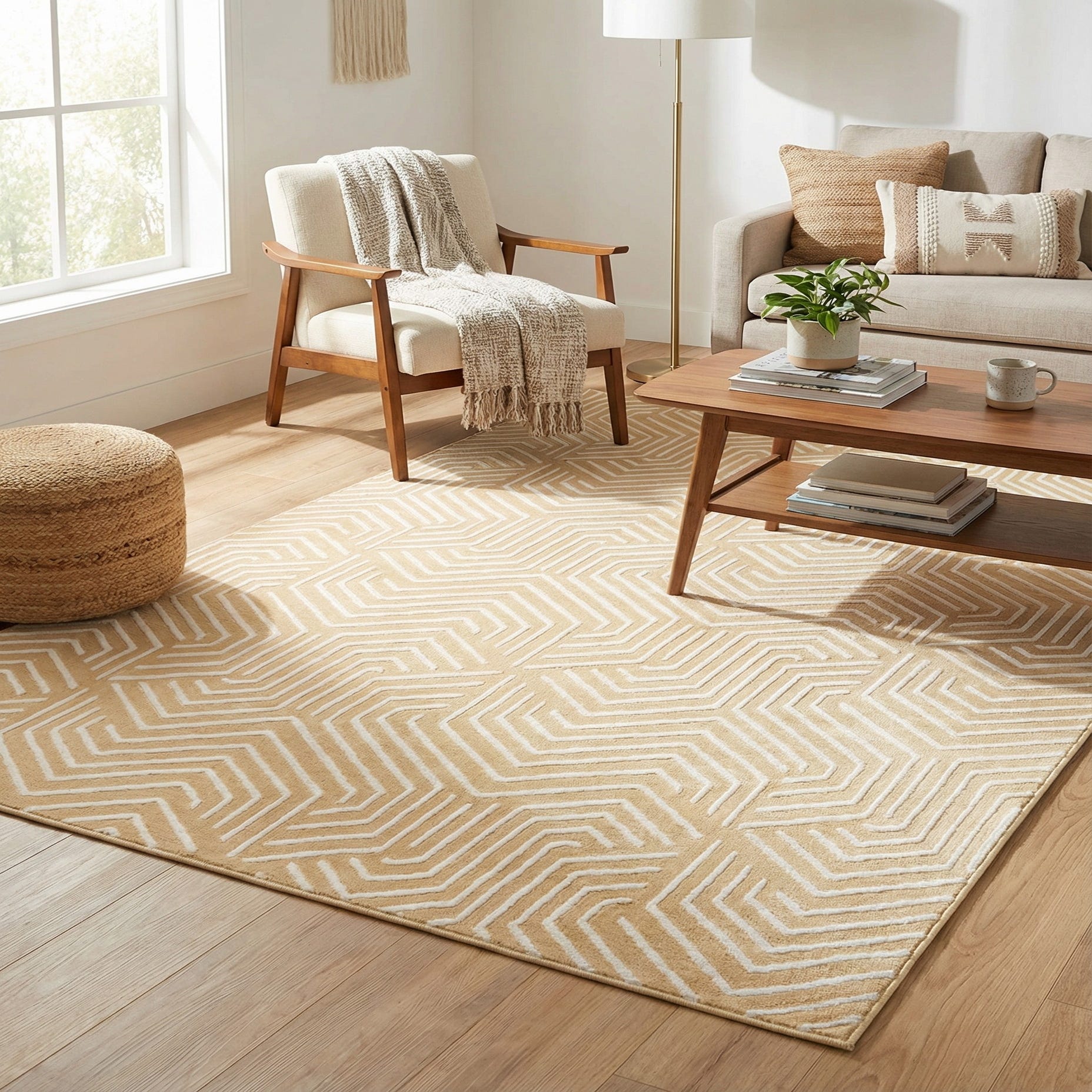 Primary color is Yellow. Colors in this rug include: Yellow, Ivory.