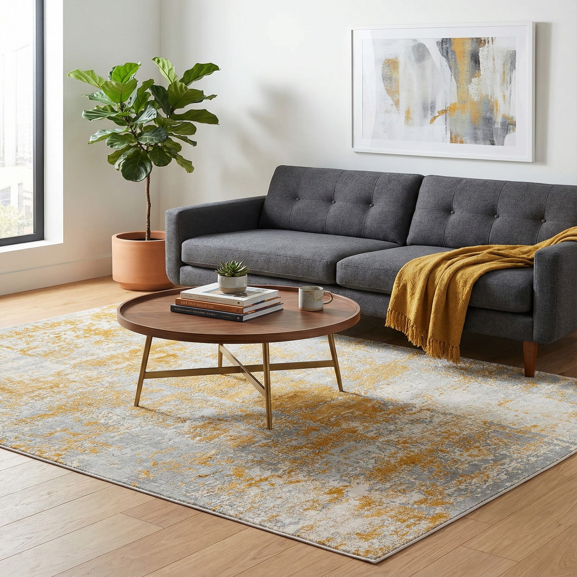 Primary color is Yellow. Colors in this rug include: Yellow, Ivory, Gray.