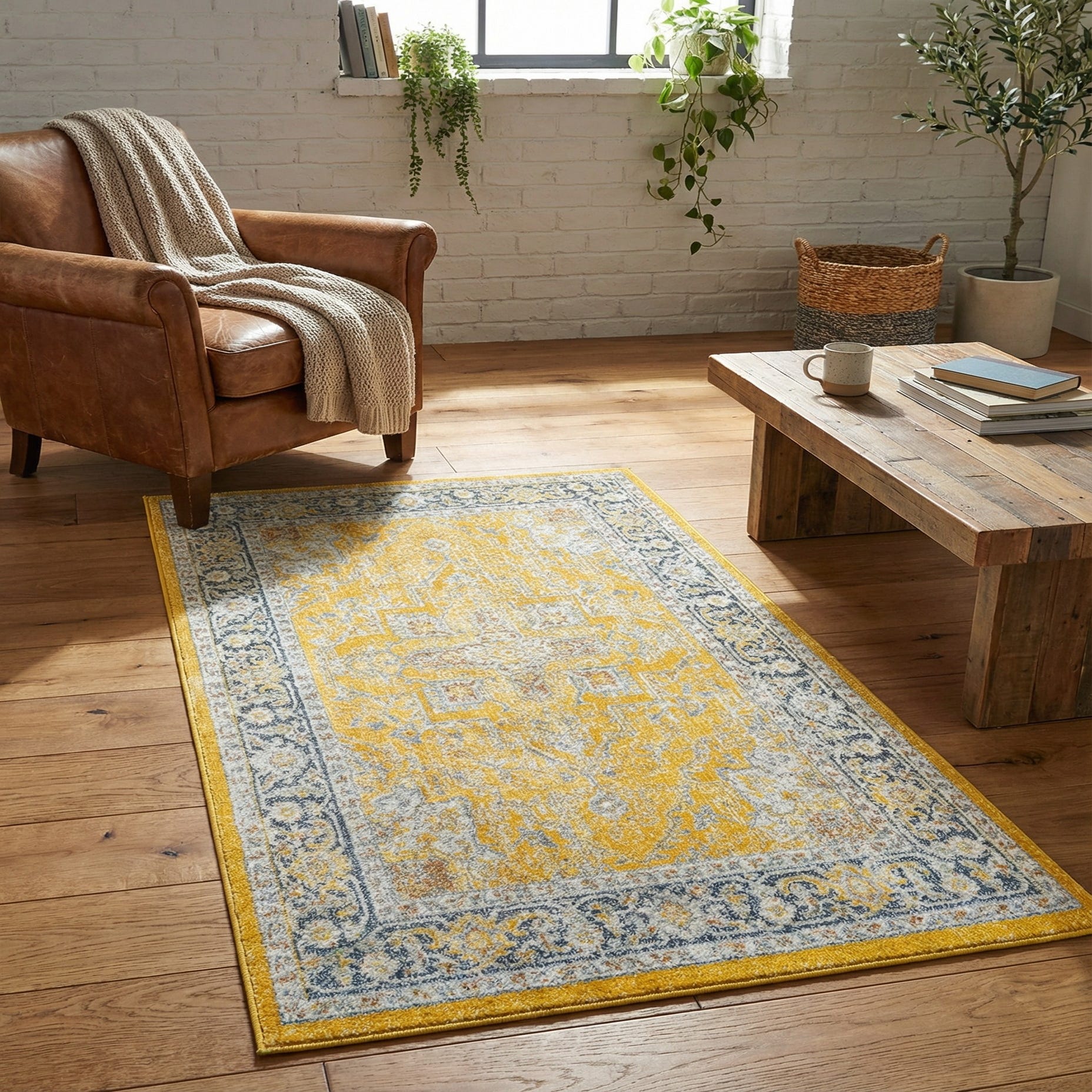 Primary color is Yellow. Colors in this rug include: Yellow, Blue, Gray, Ivory, Light Blue, Orange.