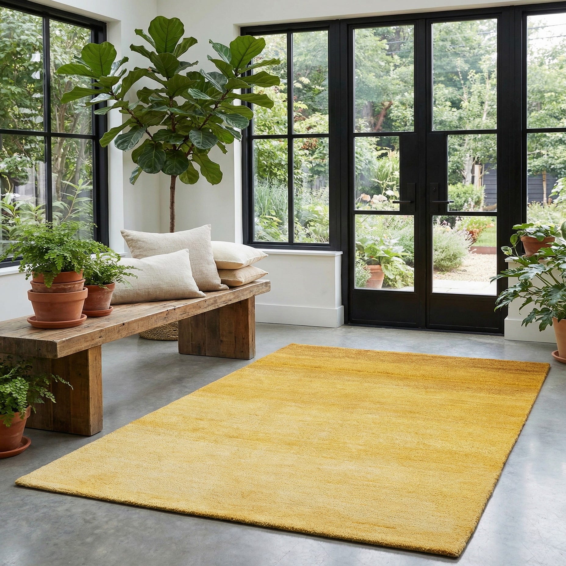 Primary color is Yellow. Colors in this rug include: Yellow, Brown, Ivory, Gold.