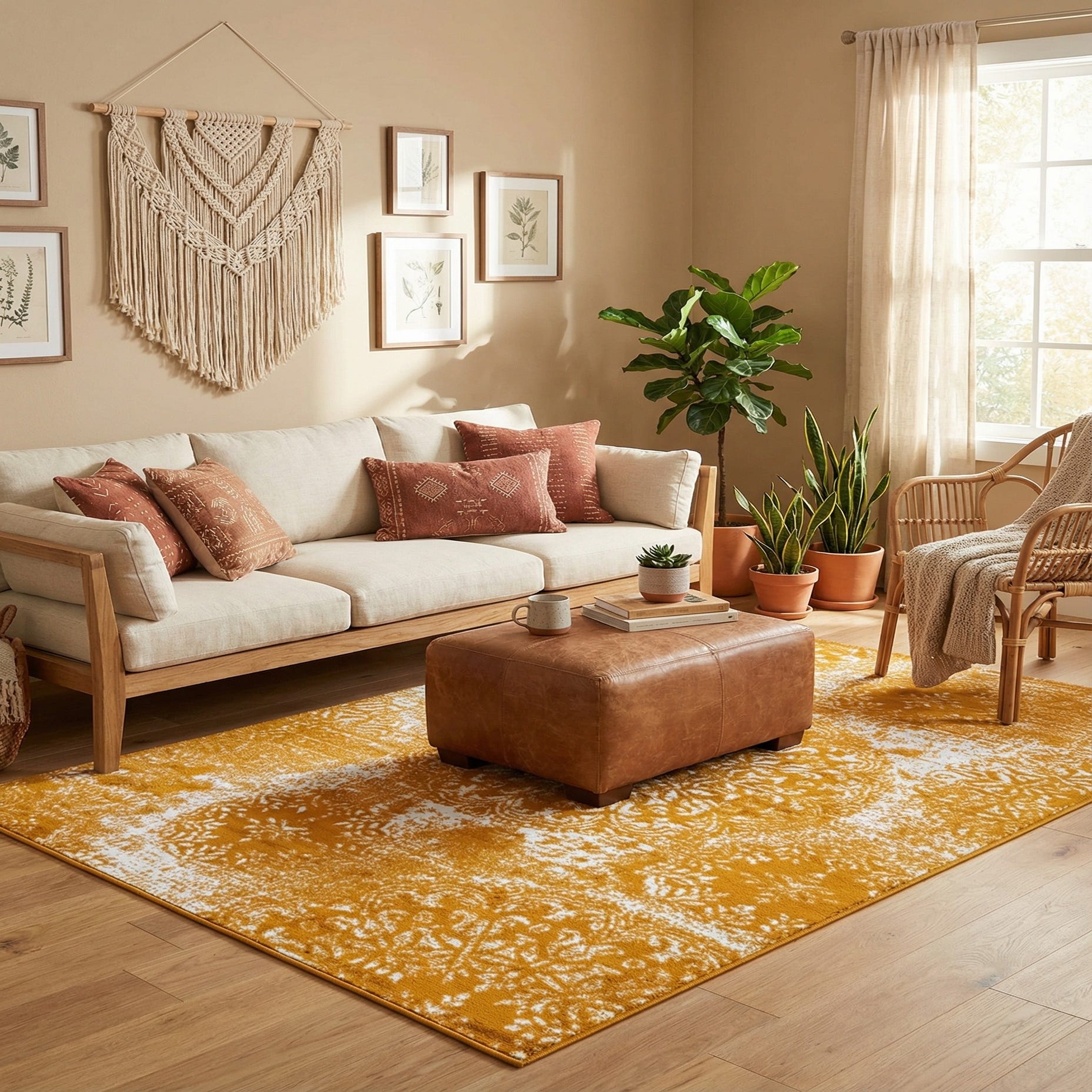 Primary color is Yellow. Colors in this rug include: Yellow, Ivory.