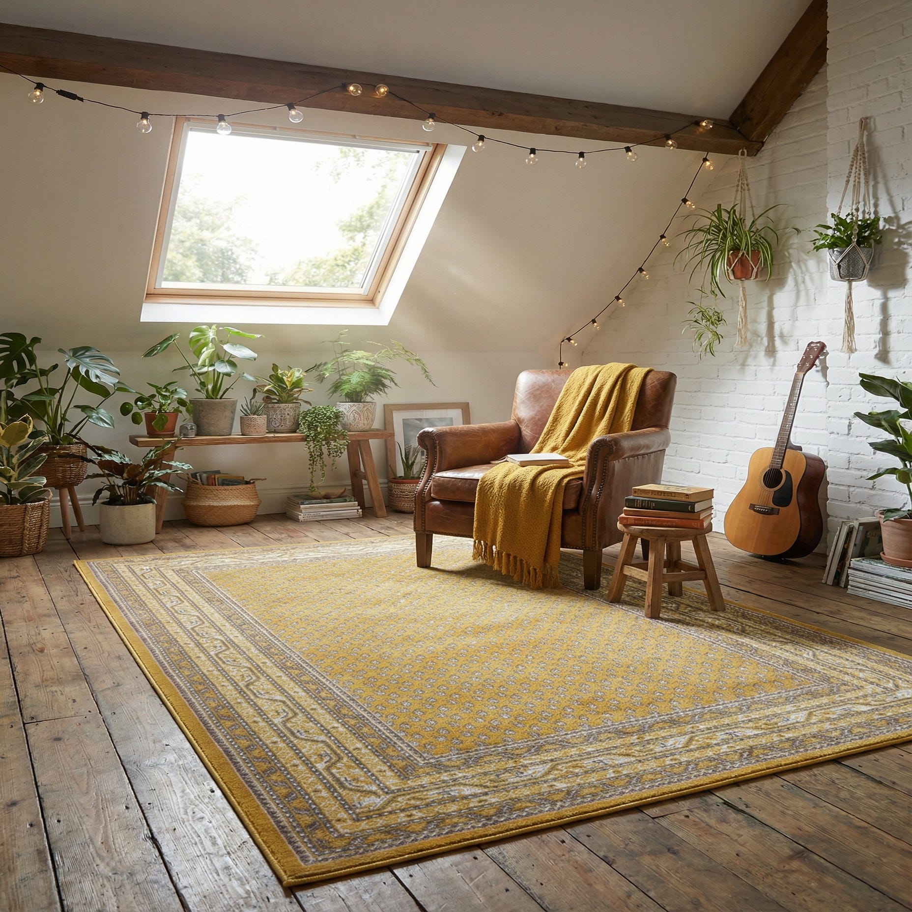 Primary color is Yellow. Colors in this rug include: Yellow, Gray, Ivory, Light Brown.