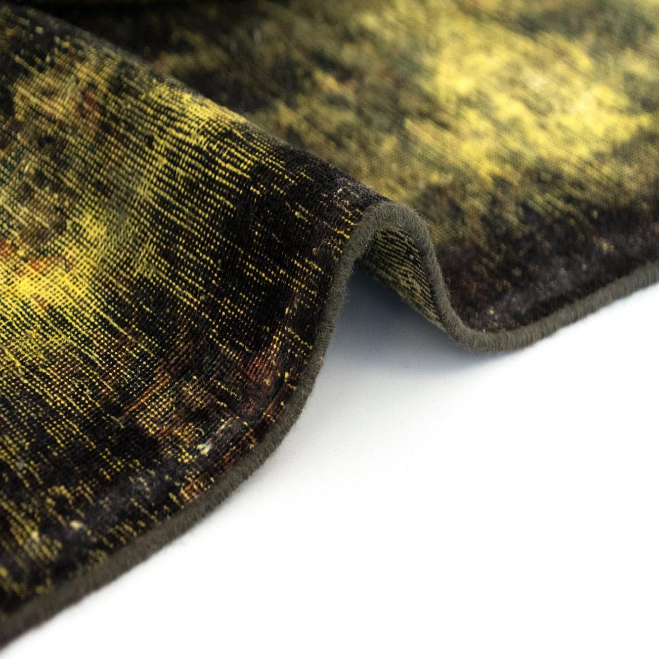 Primary color is Yellow. Colors in this rug include: Yellow, Brown, Black, Dark Green.