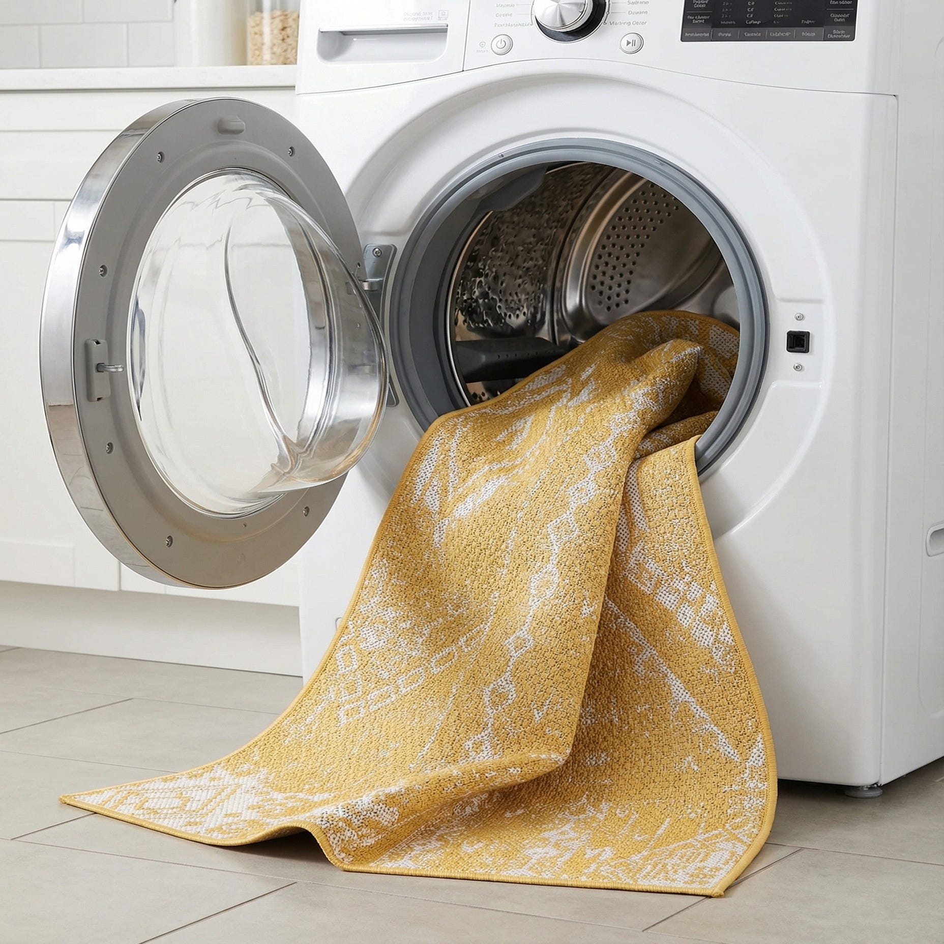 Primary color is Yellow. Colors in this rug include: Yellow, Ivory.