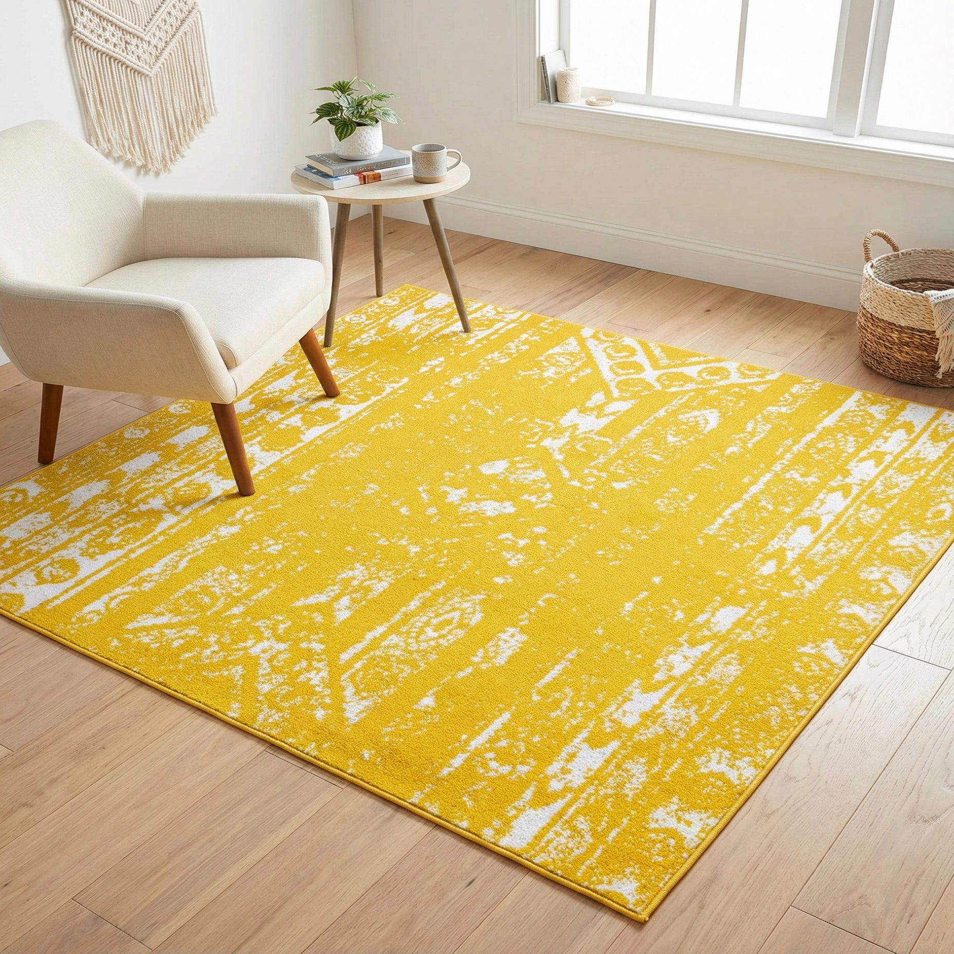 Primary color is Yellow. Colors in this rug include: Yellow, Ivory.