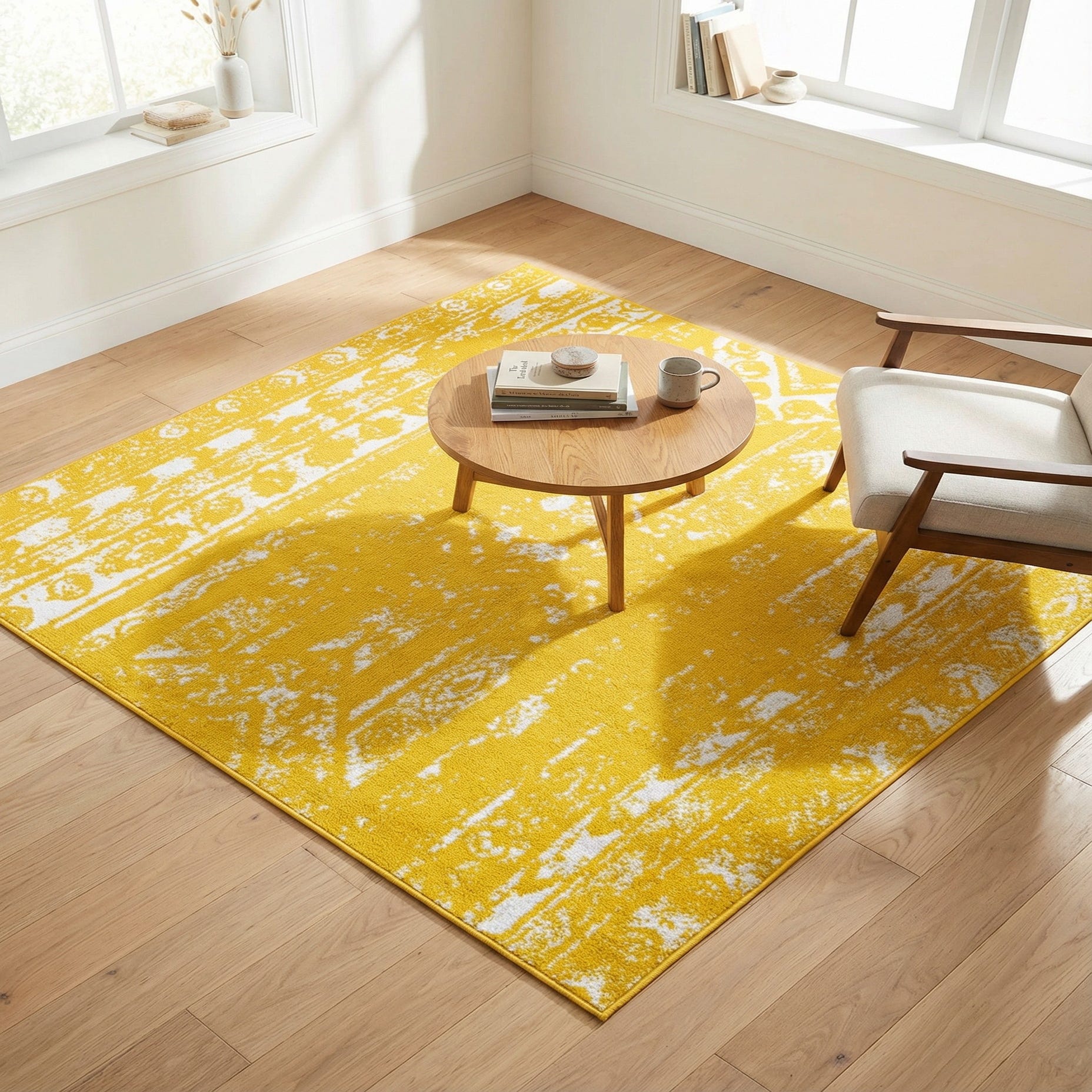 Primary color is Yellow. Colors in this rug include: Yellow, Ivory.