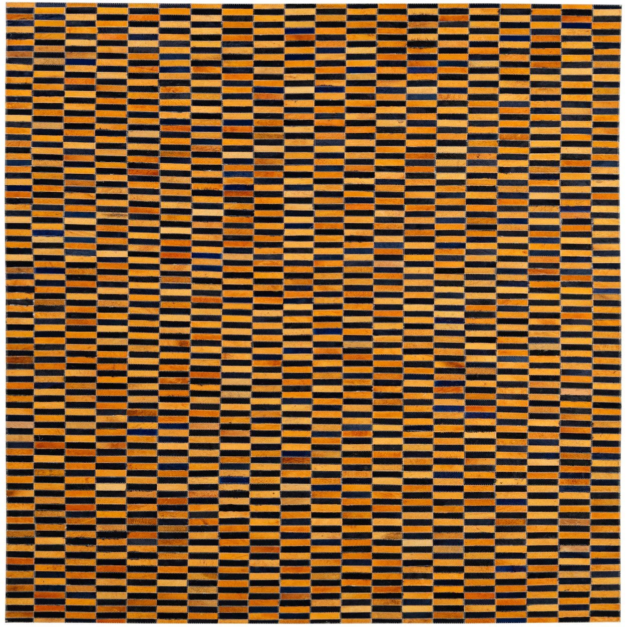 Primary color is Yellow. Colors in this rug include: Yellow, Navy Blue.