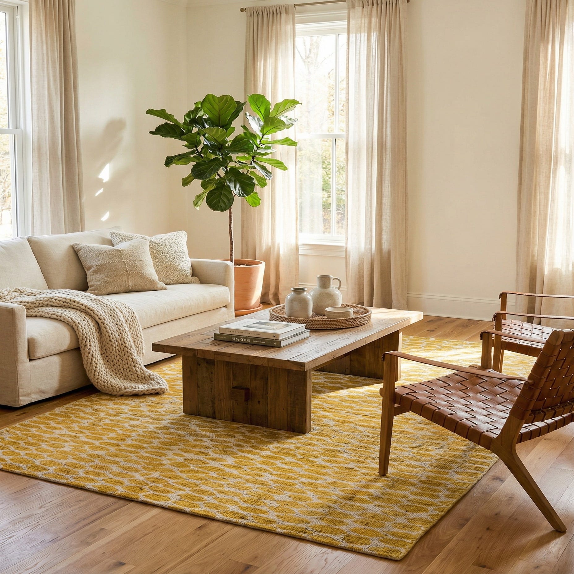 Primary color is Yellow. Colors in this rug include: Yellow, Ivory.