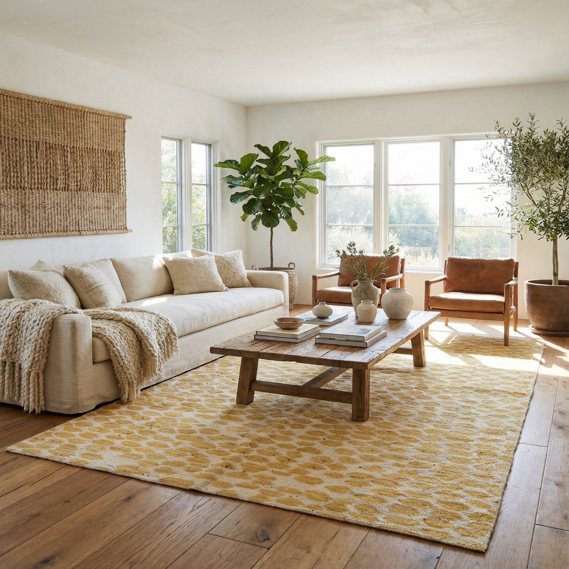 Primary color is Yellow. Colors in this rug include: Yellow, Ivory.