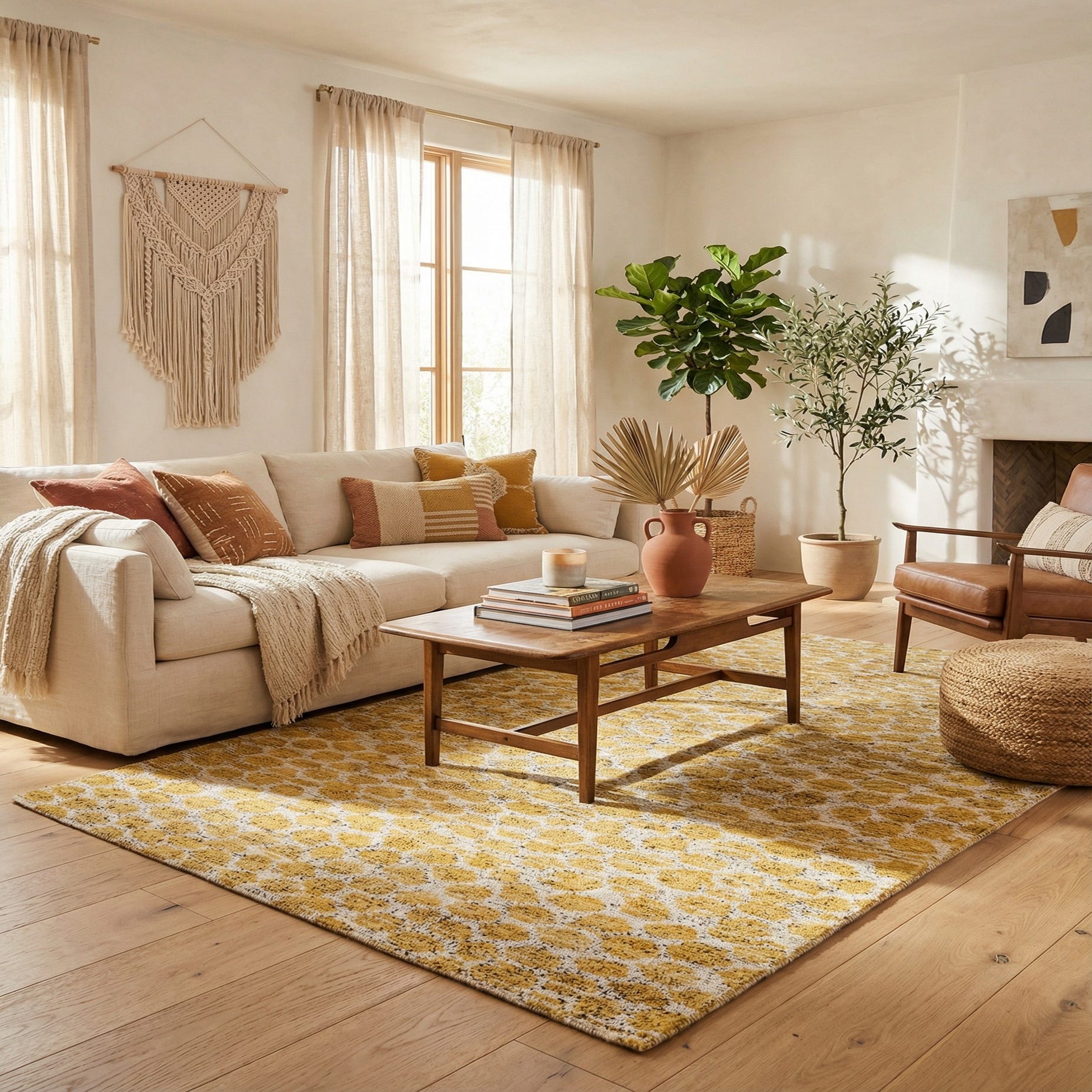 Primary color is Yellow. Colors in this rug include: Yellow, Ivory, Black.