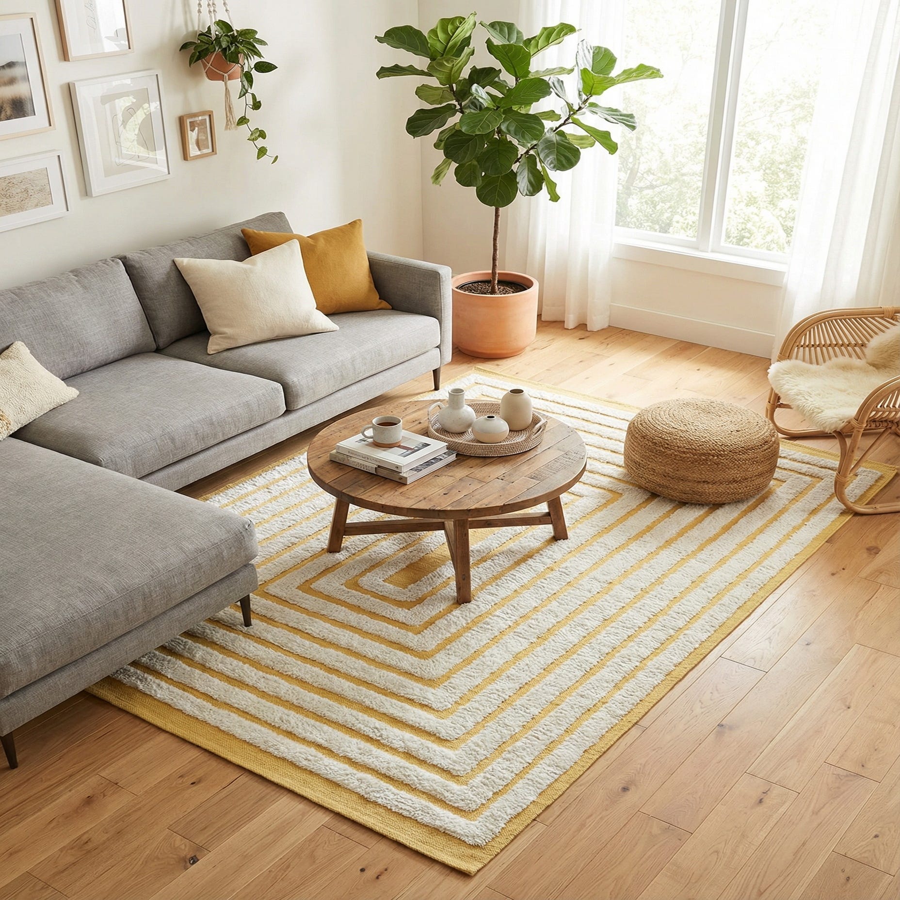 Primary color is Yellow. Colors in this rug include: Yellow, Ivory.