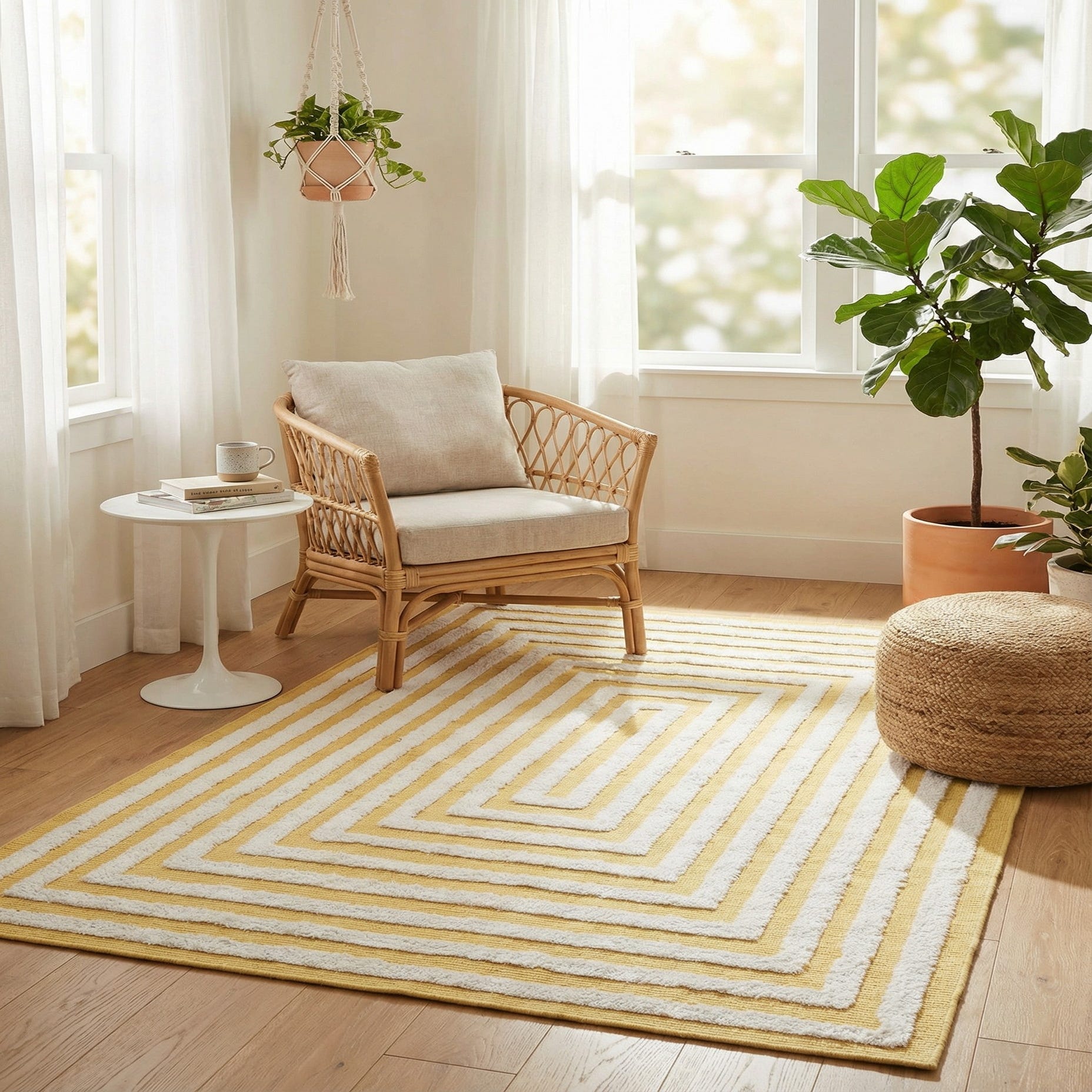 Primary color is Yellow. Colors in this rug include: Yellow, Ivory.