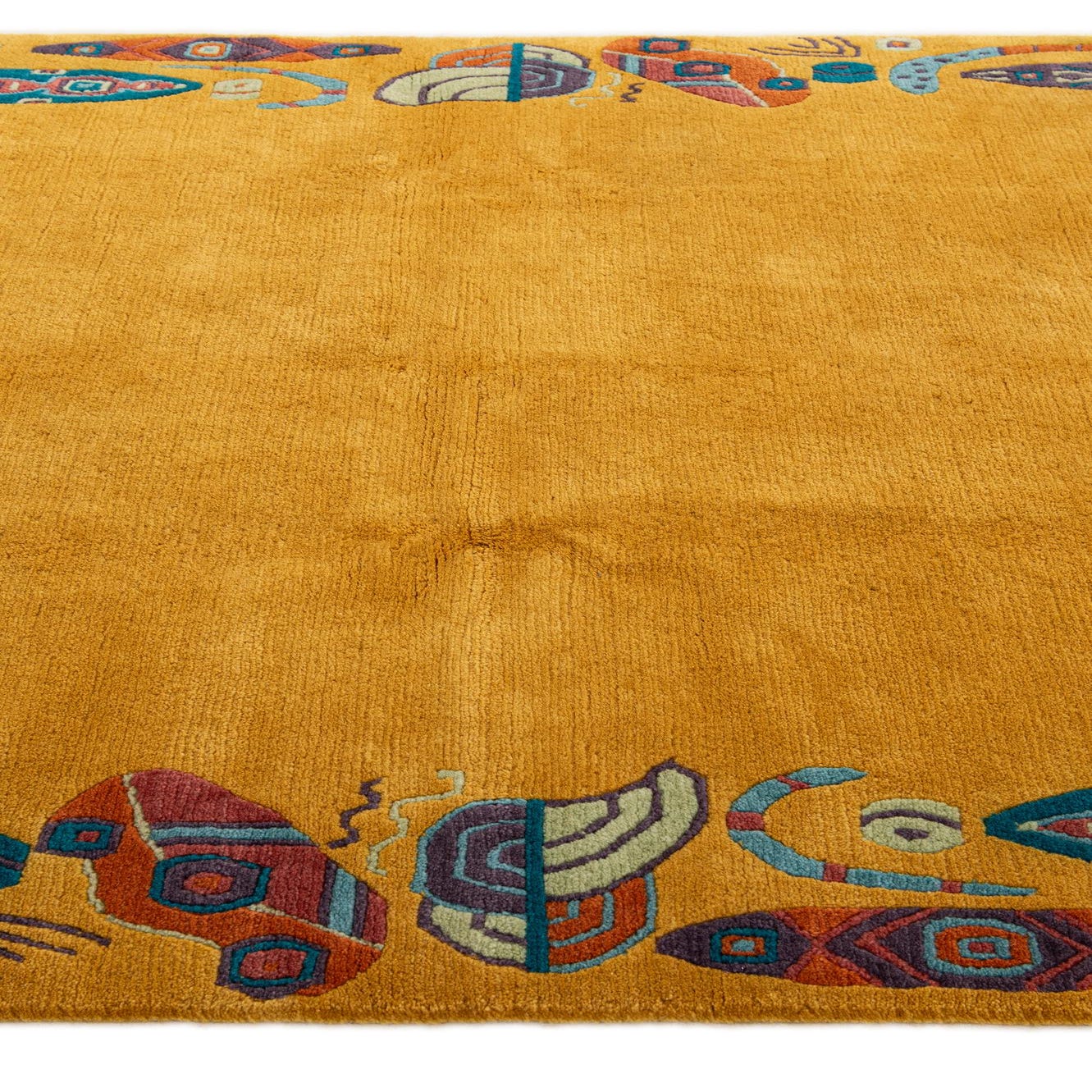 Primary color is Yellow. Colors in this rug include: Yellow, Blue, Hunter Green, Light Blue, Light Green, Orange, Purple, Pink.