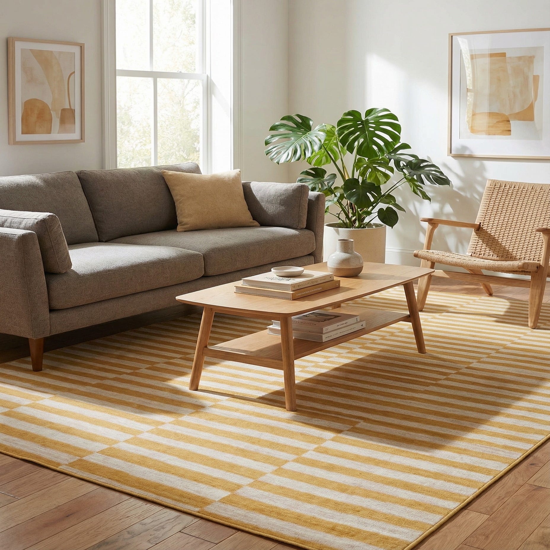 Primary color is Yellow. Colors in this rug include: Yellow, Ivory.