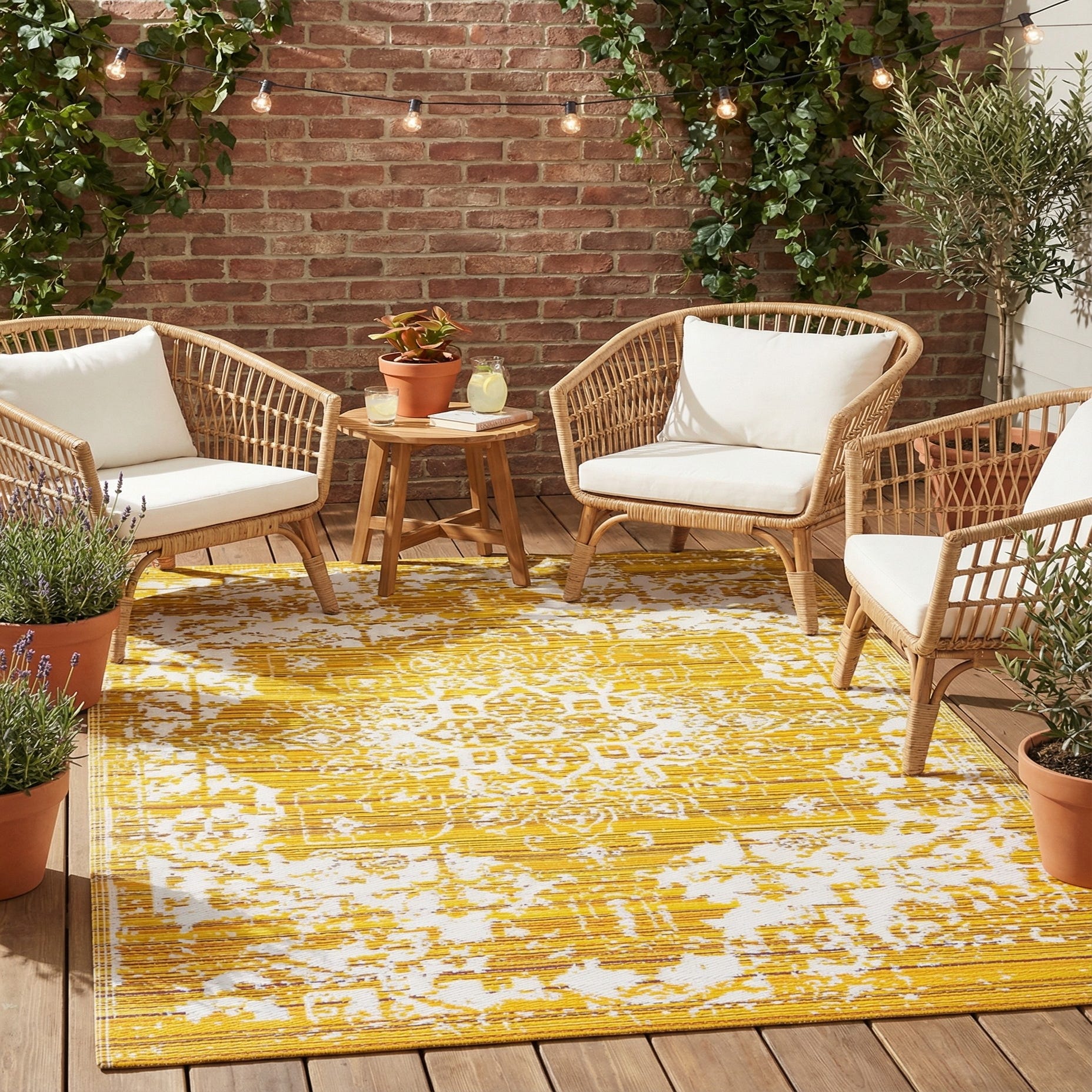 Primary color is Yellow. Colors in this rug include: Yellow, Brown, Ivory.