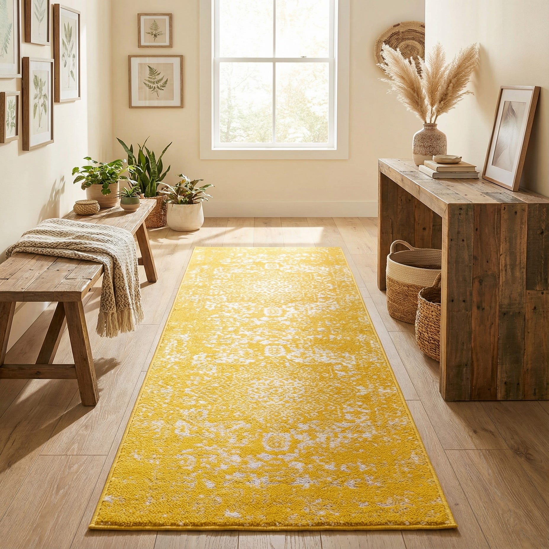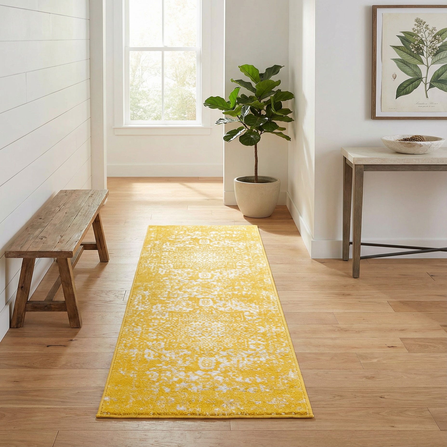 Primary color is Yellow. Colors in this rug include: Yellow, Ivory.