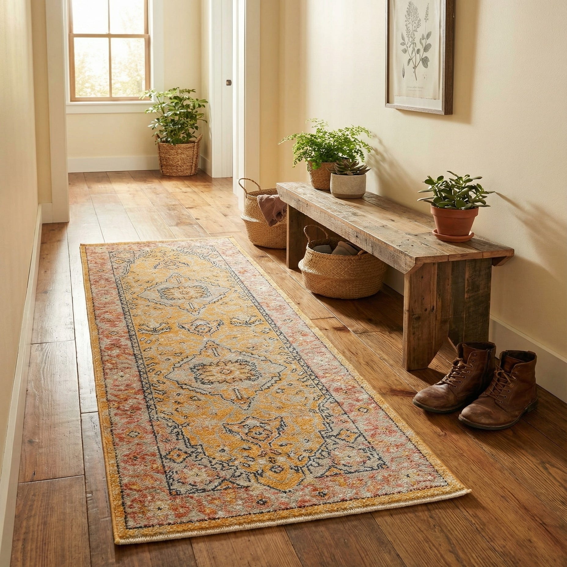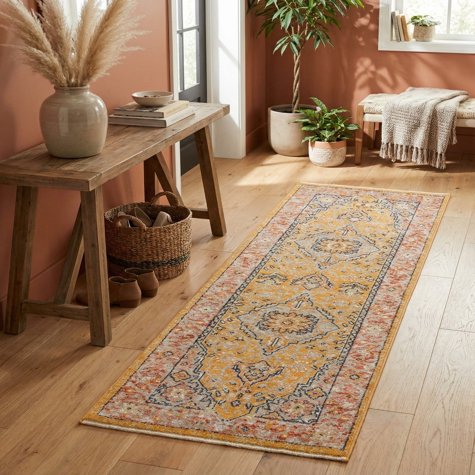 Primary color is Yellow. Colors in this rug include: Yellow, Blue, Rust Red, Ivory.