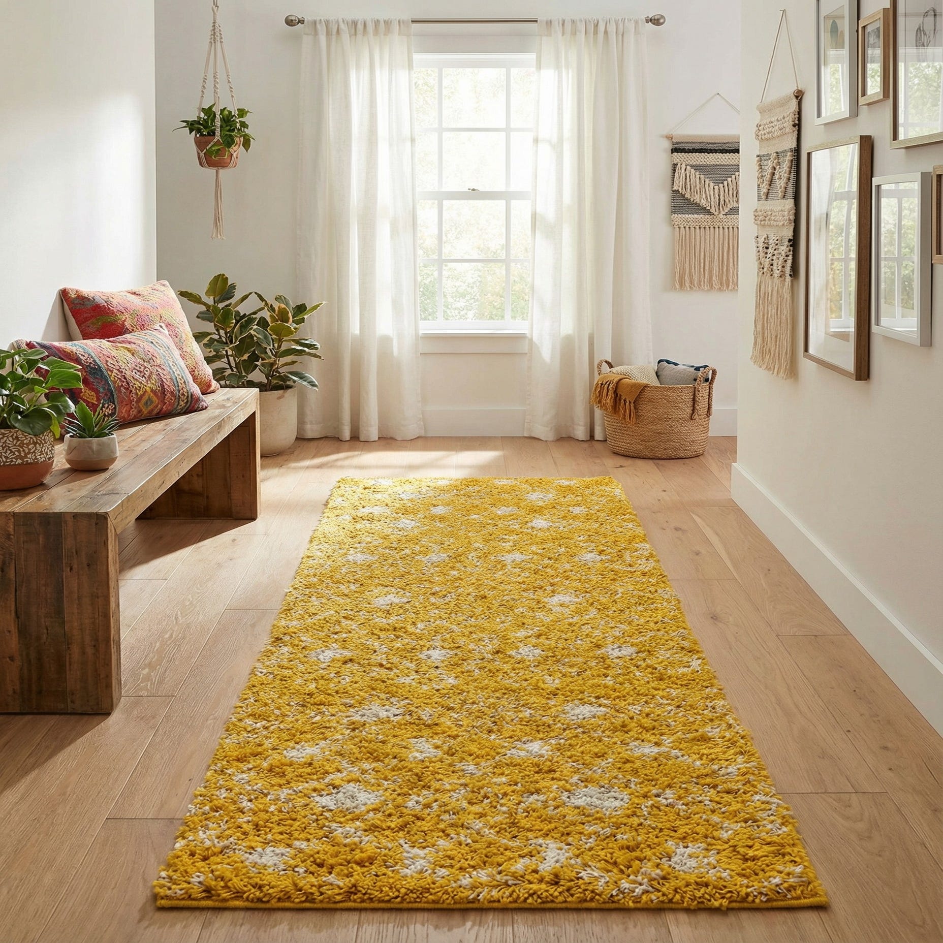 Primary color is Yellow. Colors in this rug include: Yellow, Ivory.