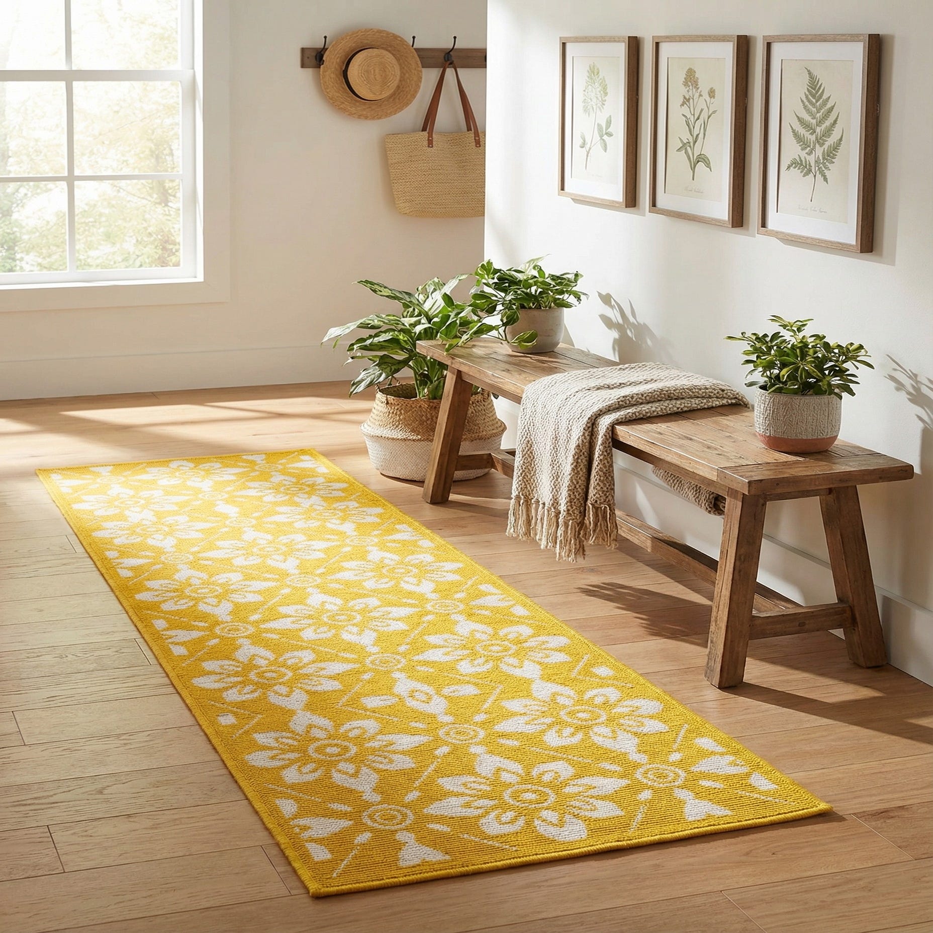 Primary color is Yellow. Colors in this rug include: Yellow, Ivory.