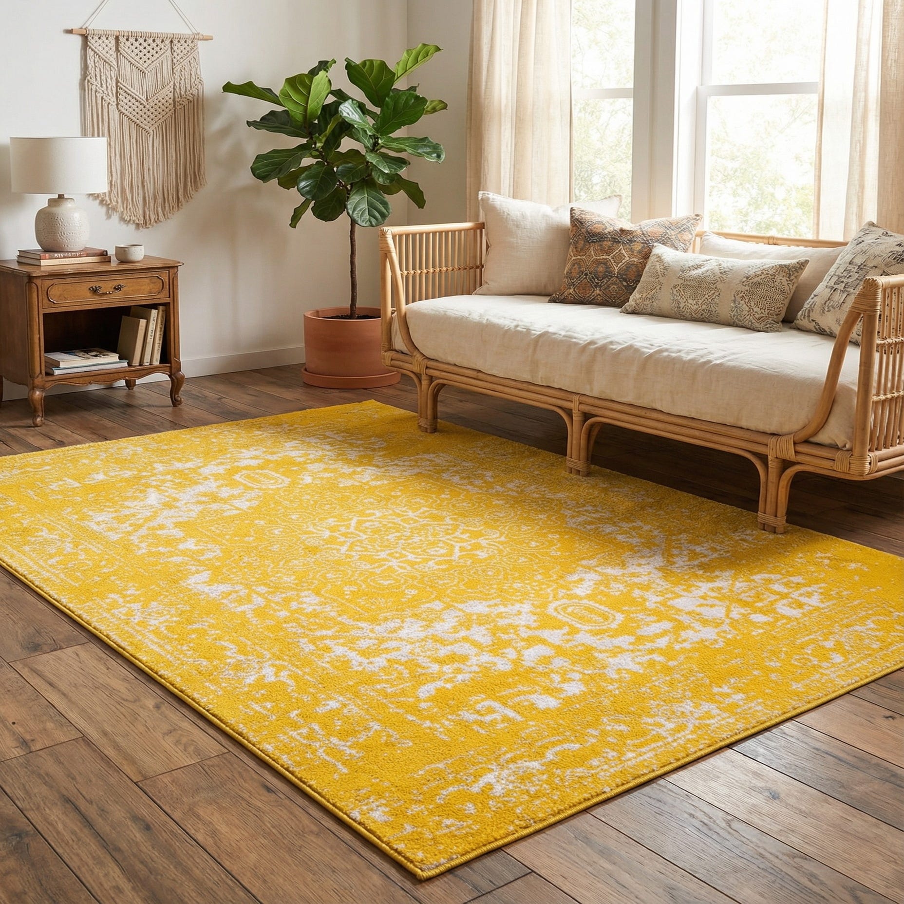 Primary color is Yellow. Colors in this rug include: Yellow, Ivory.