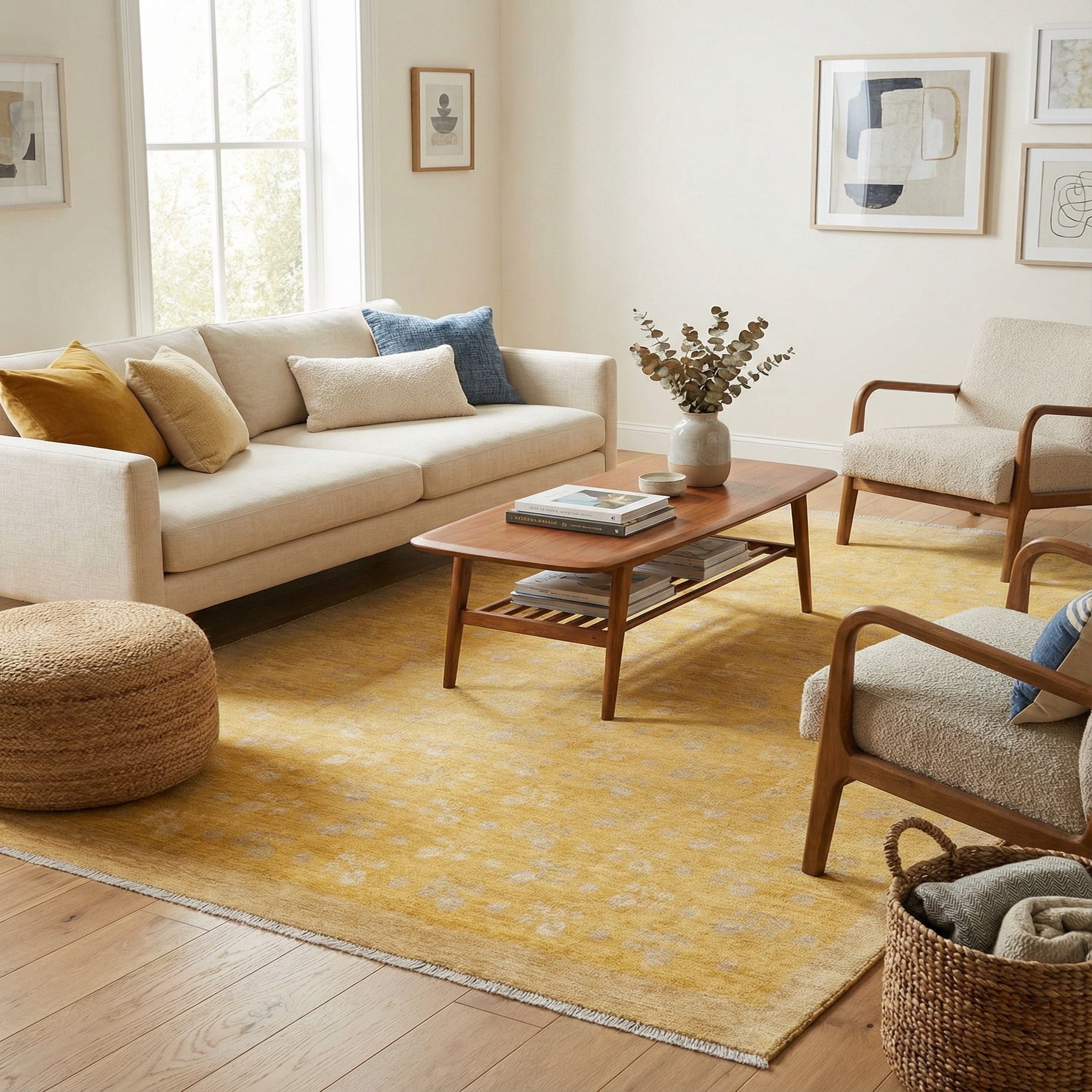Primary color is Yellow. Colors in this rug include: Yellow, Beige.