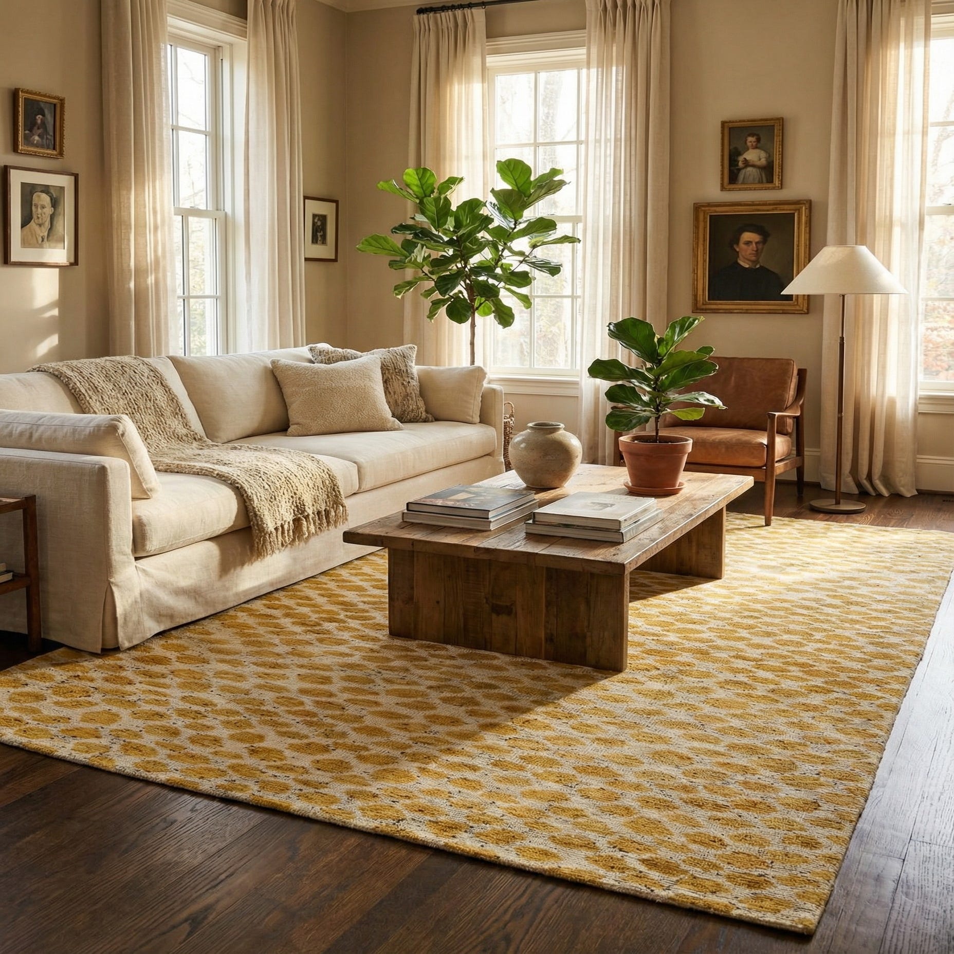 Primary color is Yellow. Colors in this rug include: Yellow, Ivory.