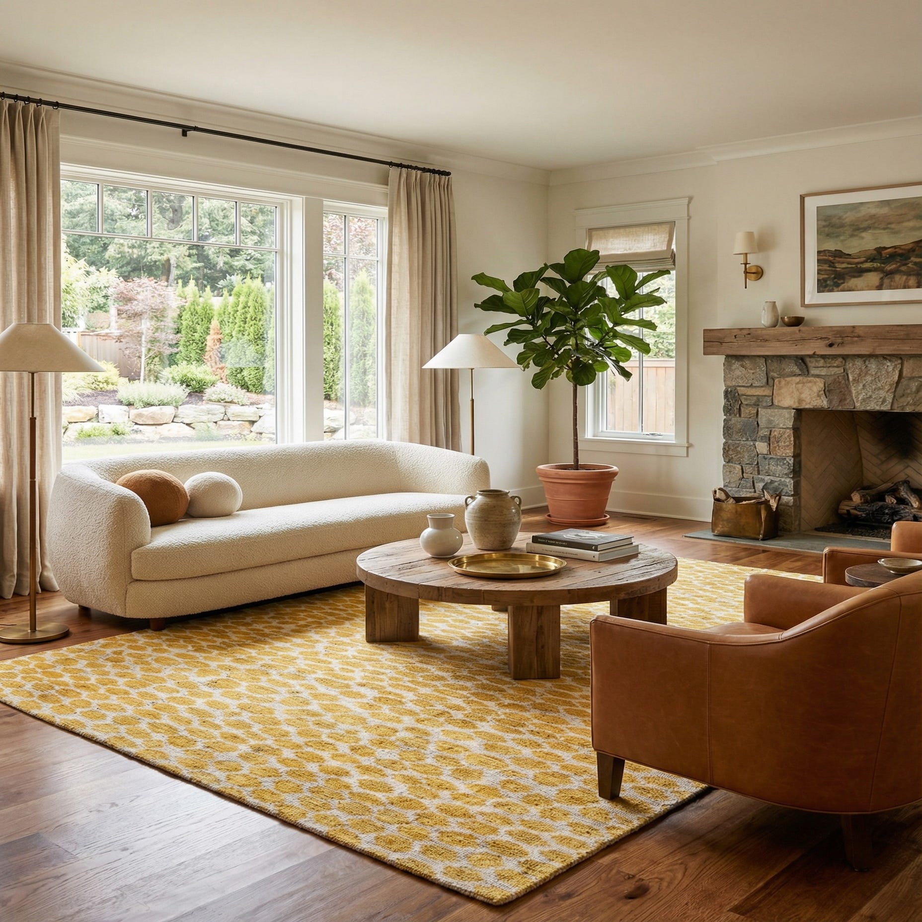 Primary color is Yellow. Colors in this rug include: Yellow, Ivory.