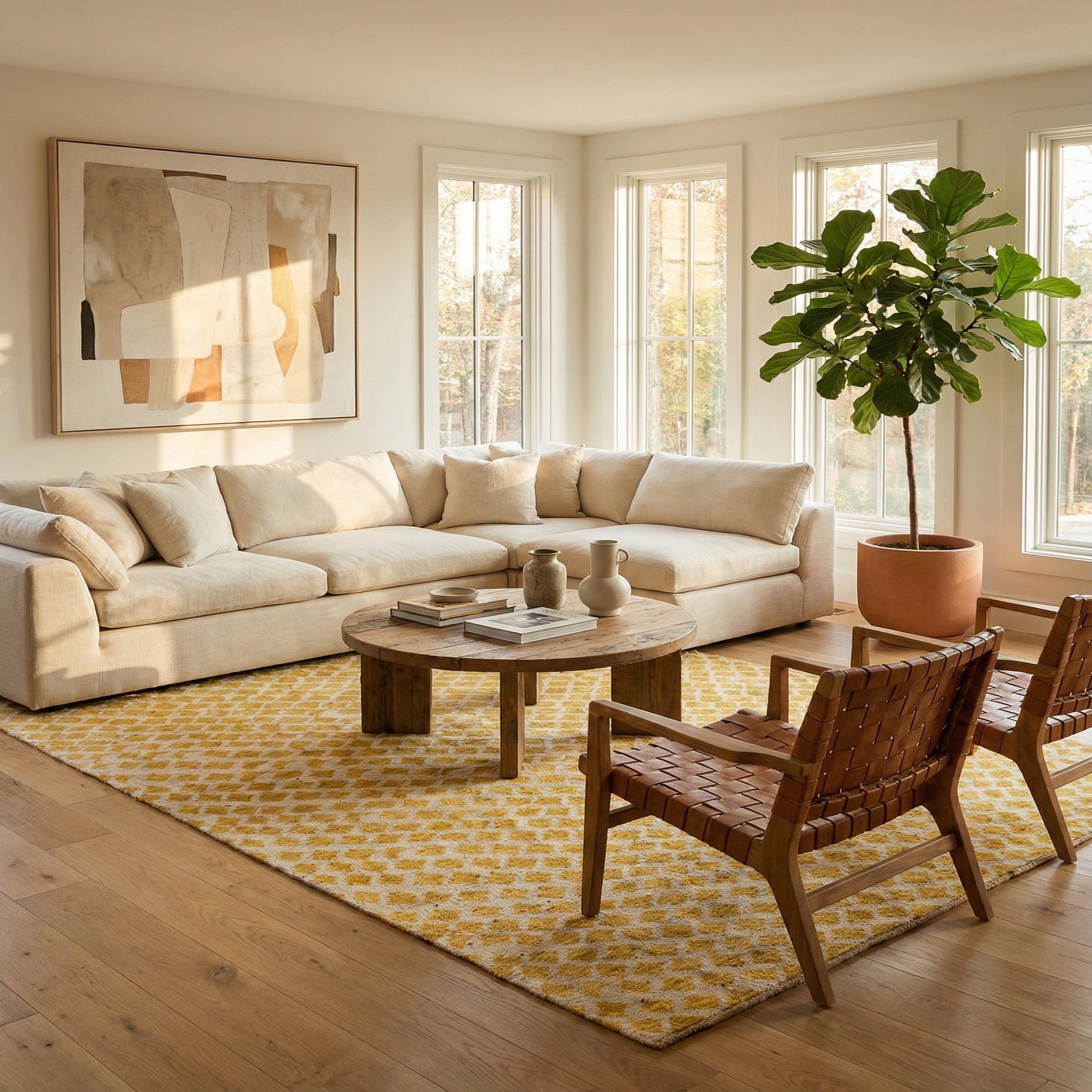 Primary color is Yellow. Colors in this rug include: Yellow, Ivory.