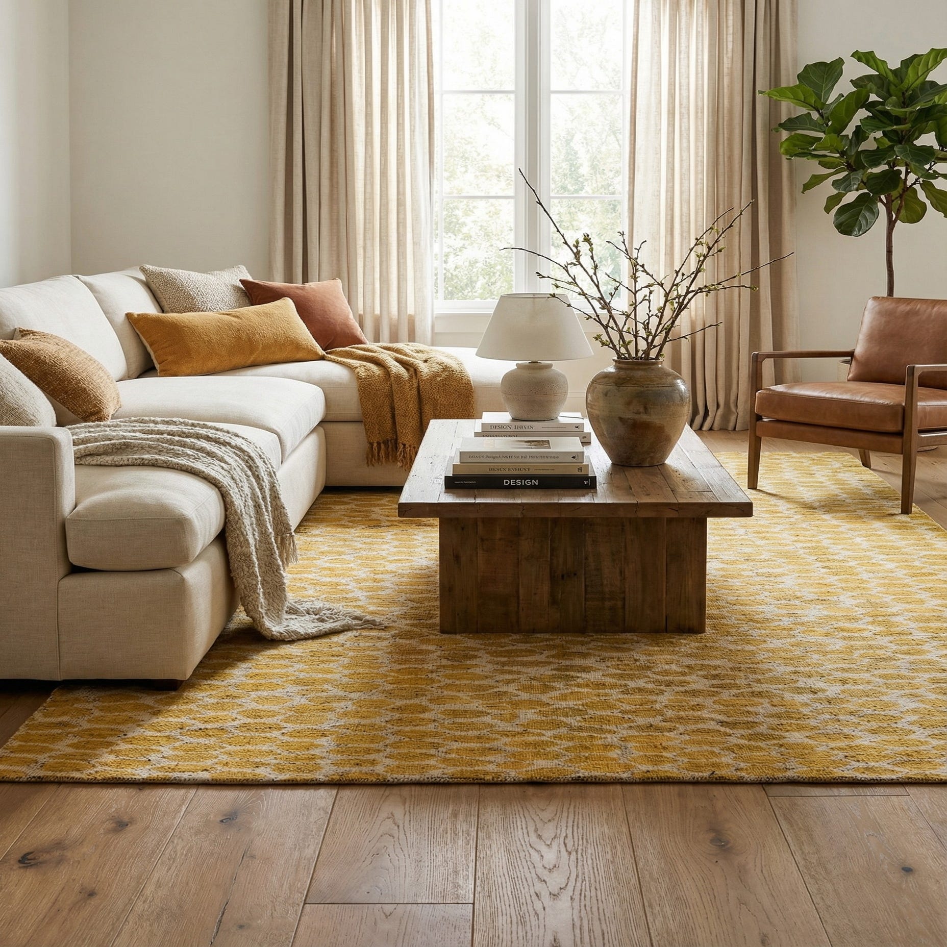 Primary color is Yellow. Colors in this rug include: Yellow, Ivory.