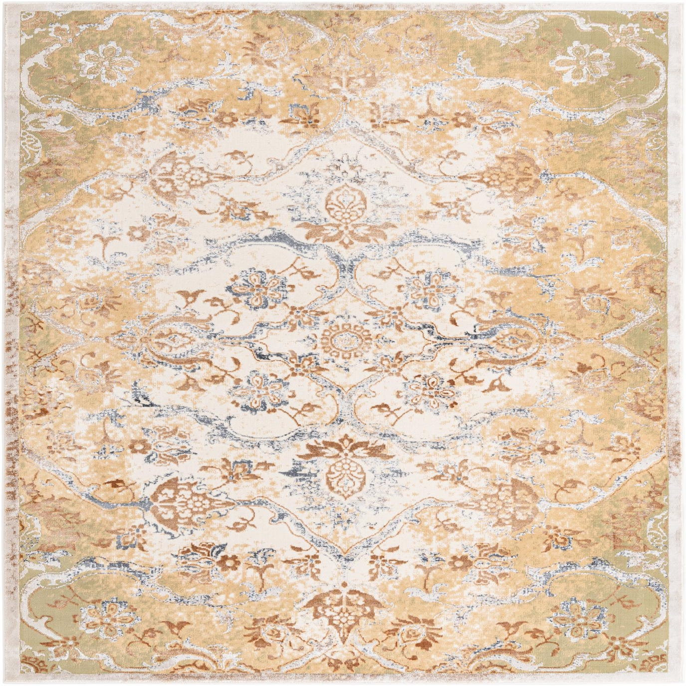Primary color is Yellow. Colors in this rug include: Yellow, Brown, Gray, Green, Ivory, Light Brown.