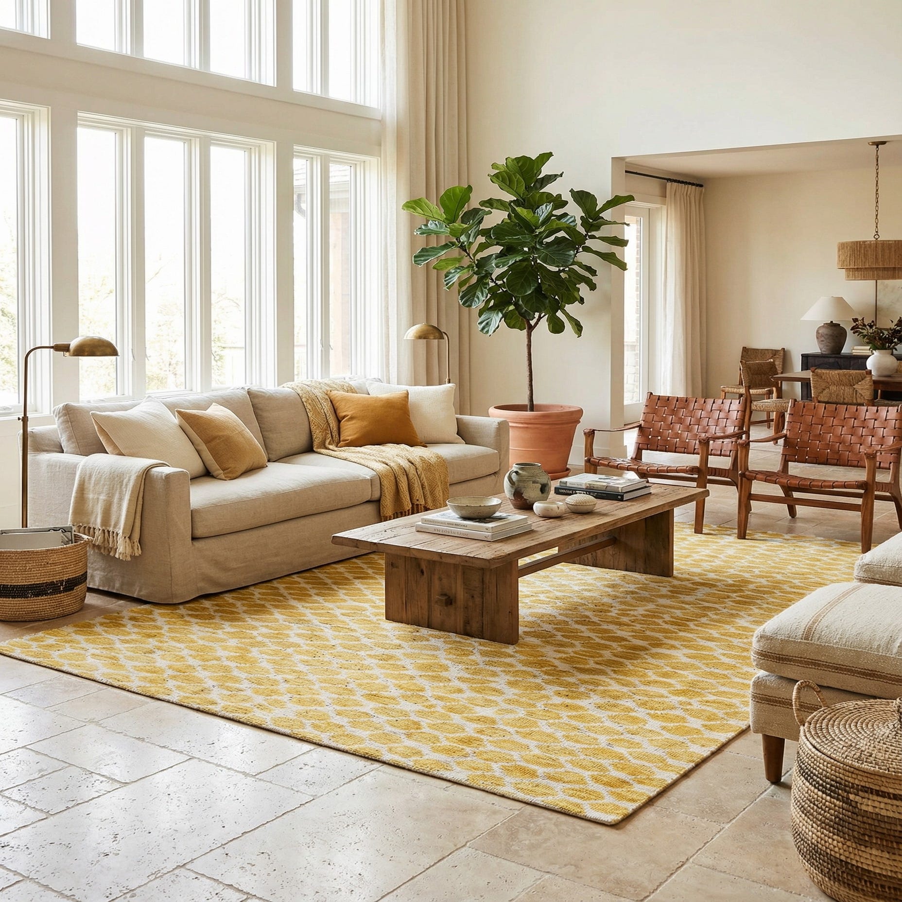 Primary color is Yellow. Colors in this rug include: Yellow, Ivory.