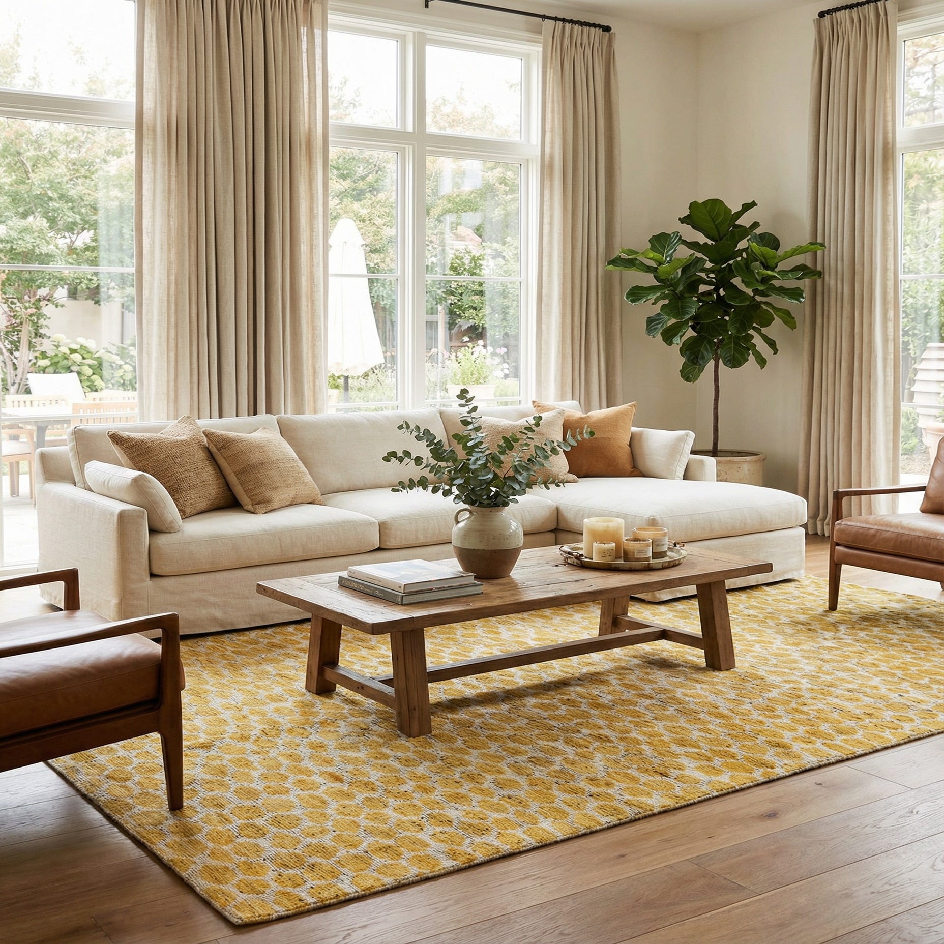 Primary color is Yellow. Colors in this rug include: Yellow, Ivory.