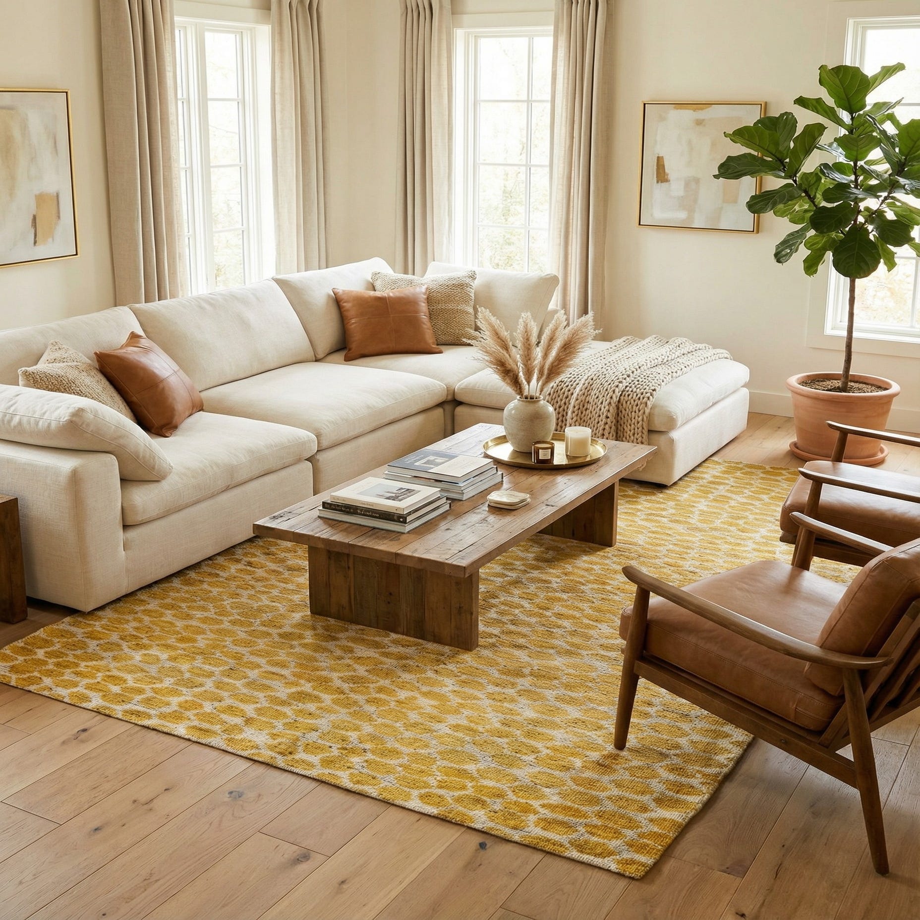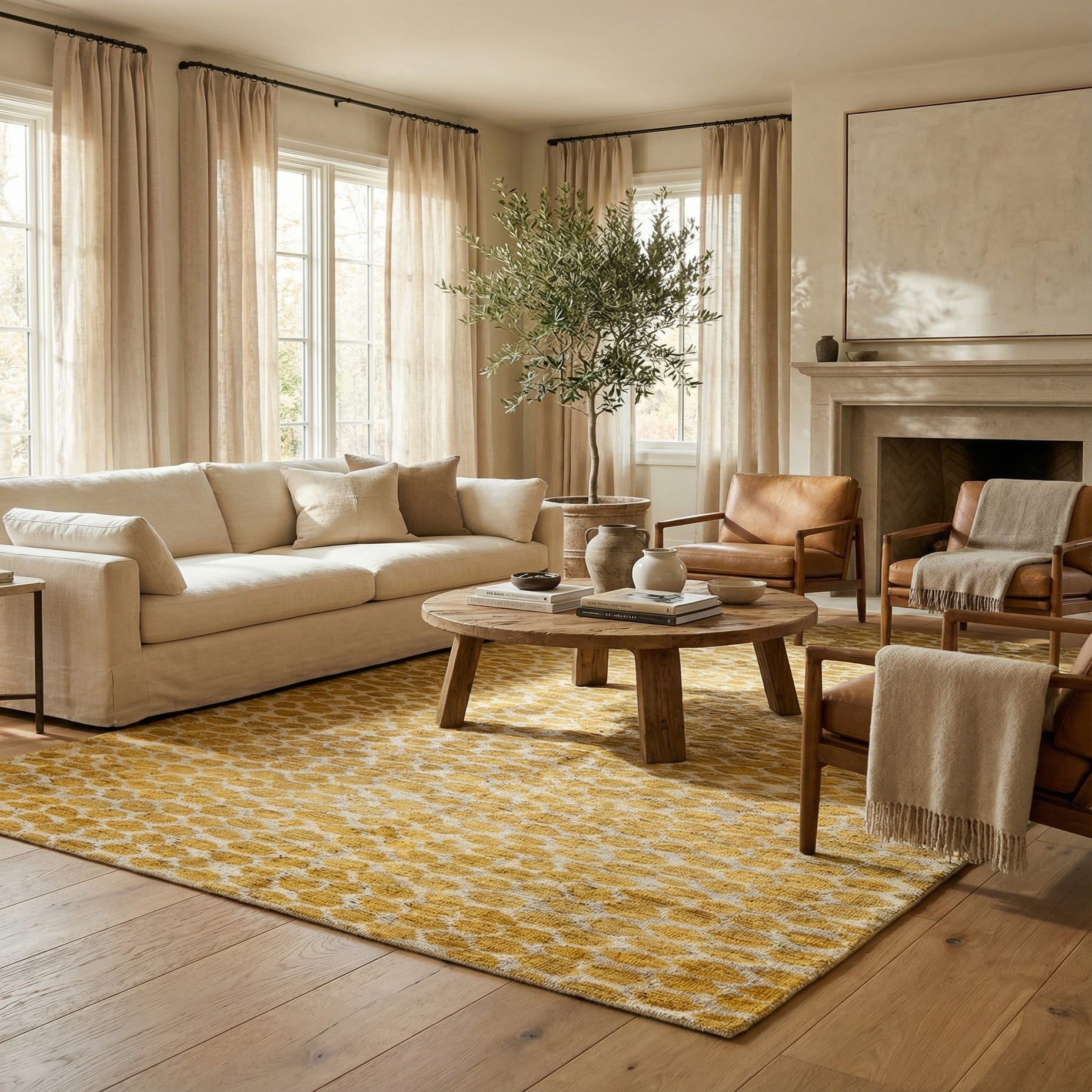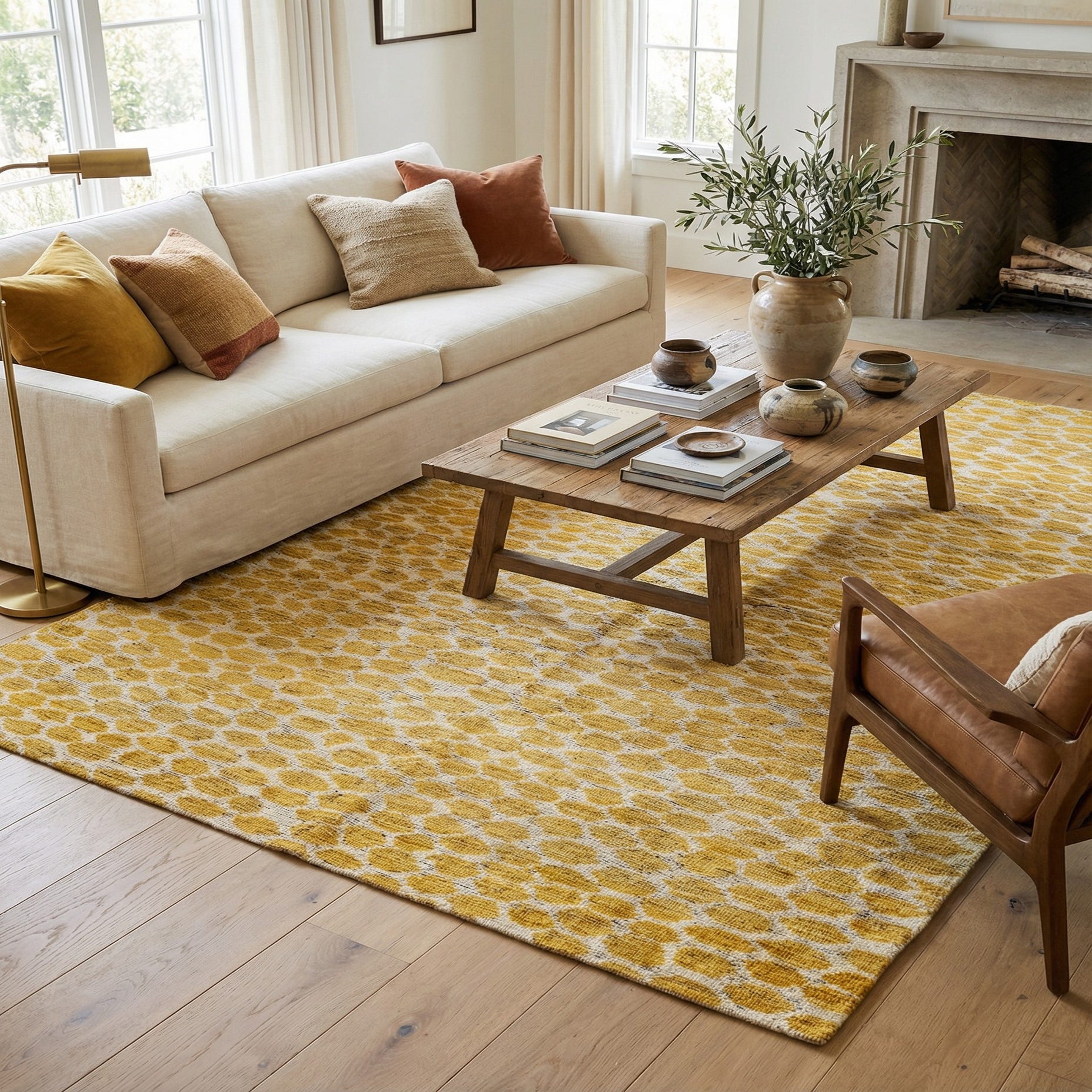 Primary color is Yellow. Colors in this rug include: Yellow, Ivory.