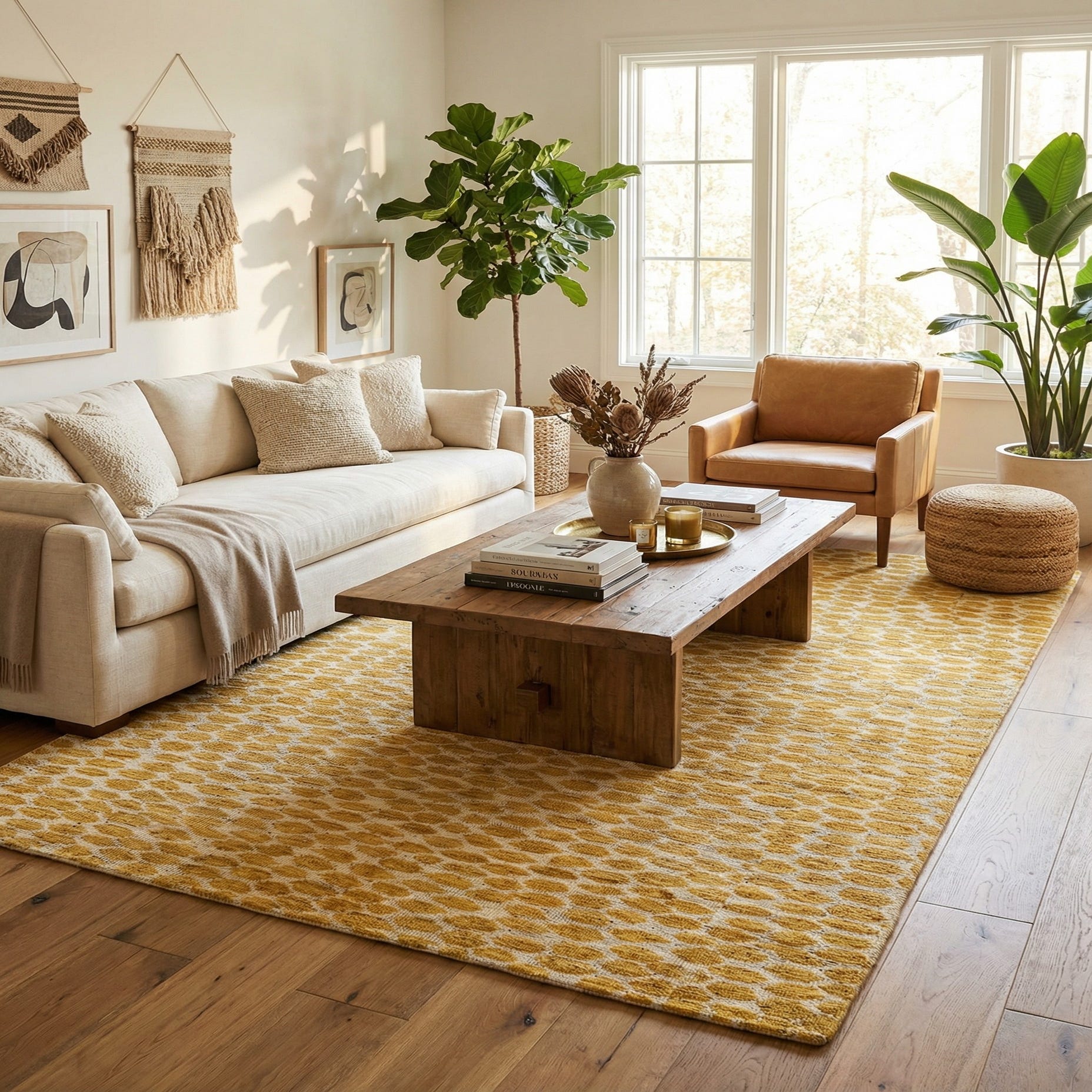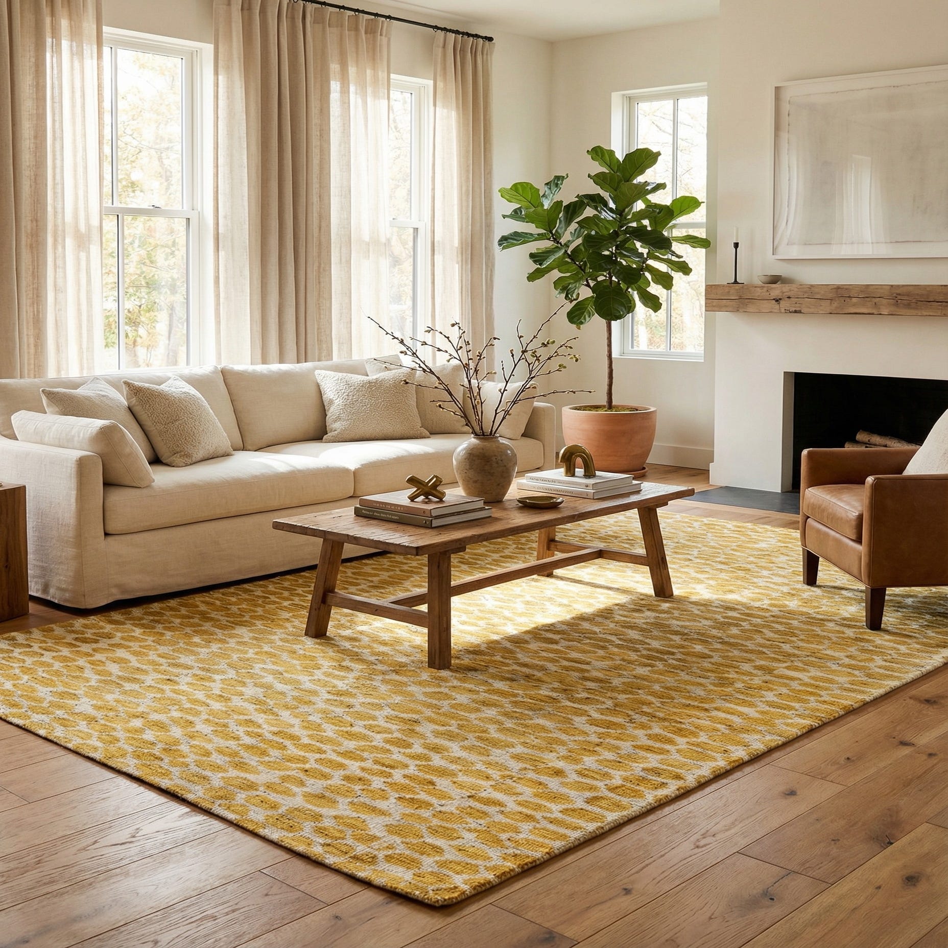 Primary color is Yellow. Colors in this rug include: Yellow, Ivory.