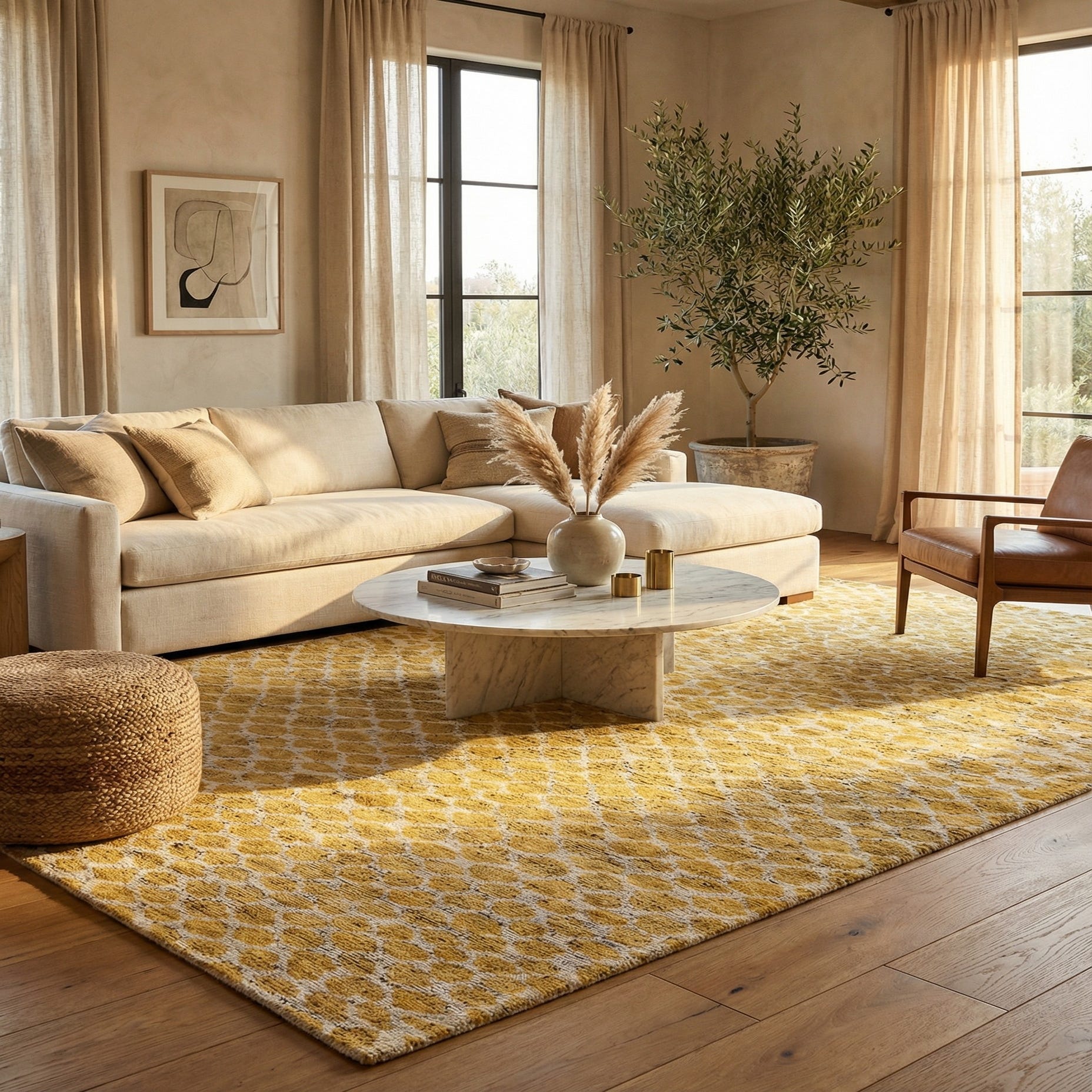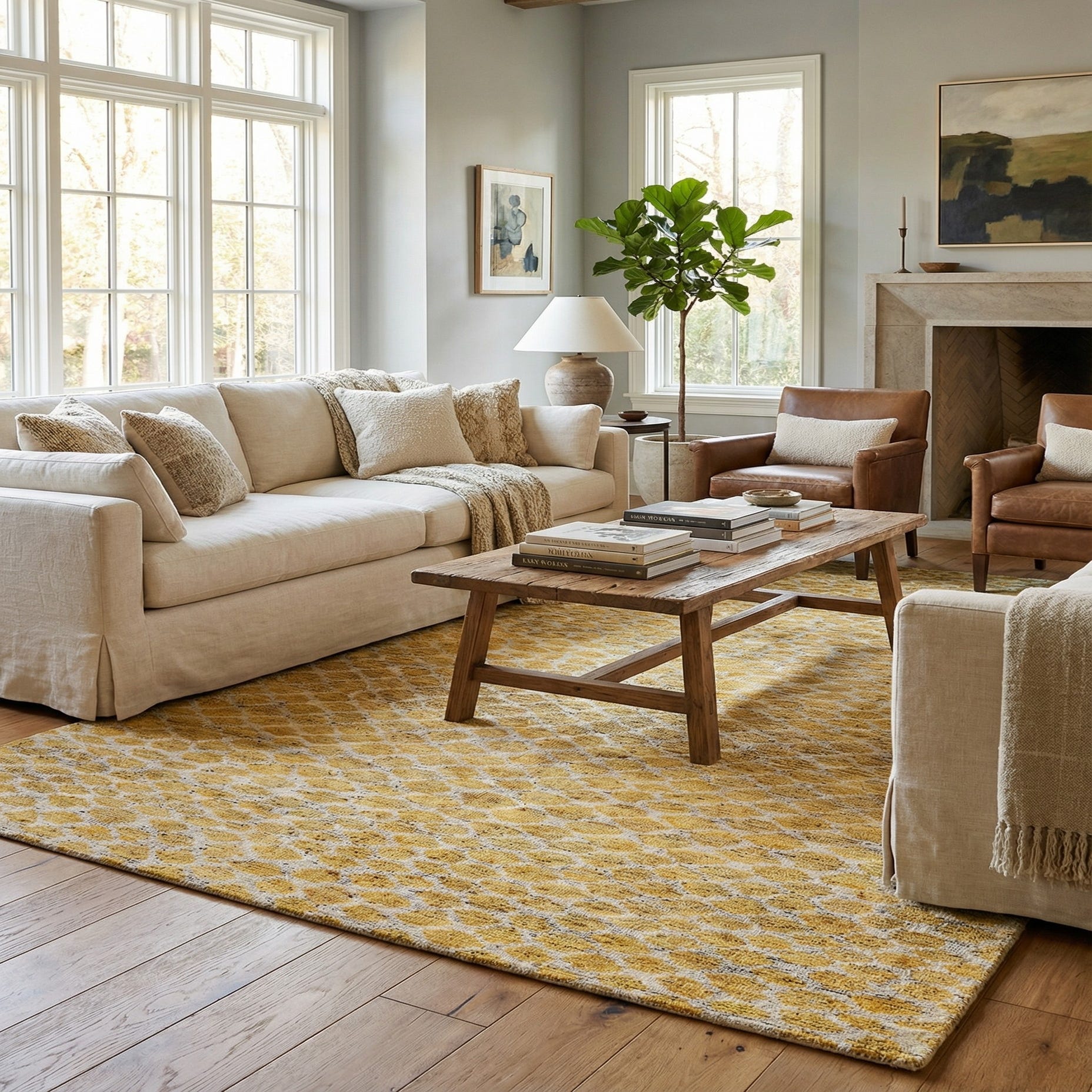 Primary color is Yellow. Colors in this rug include: Yellow, Ivory.
