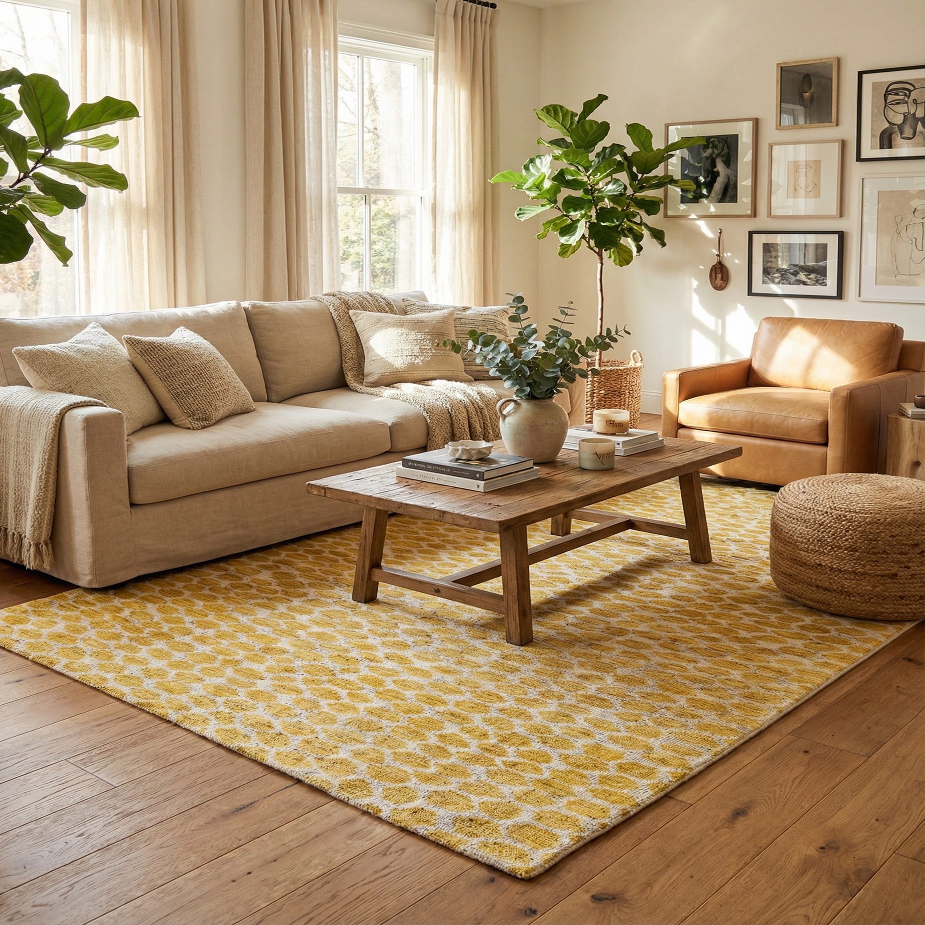 Primary color is Yellow. Colors in this rug include: Yellow, Ivory.