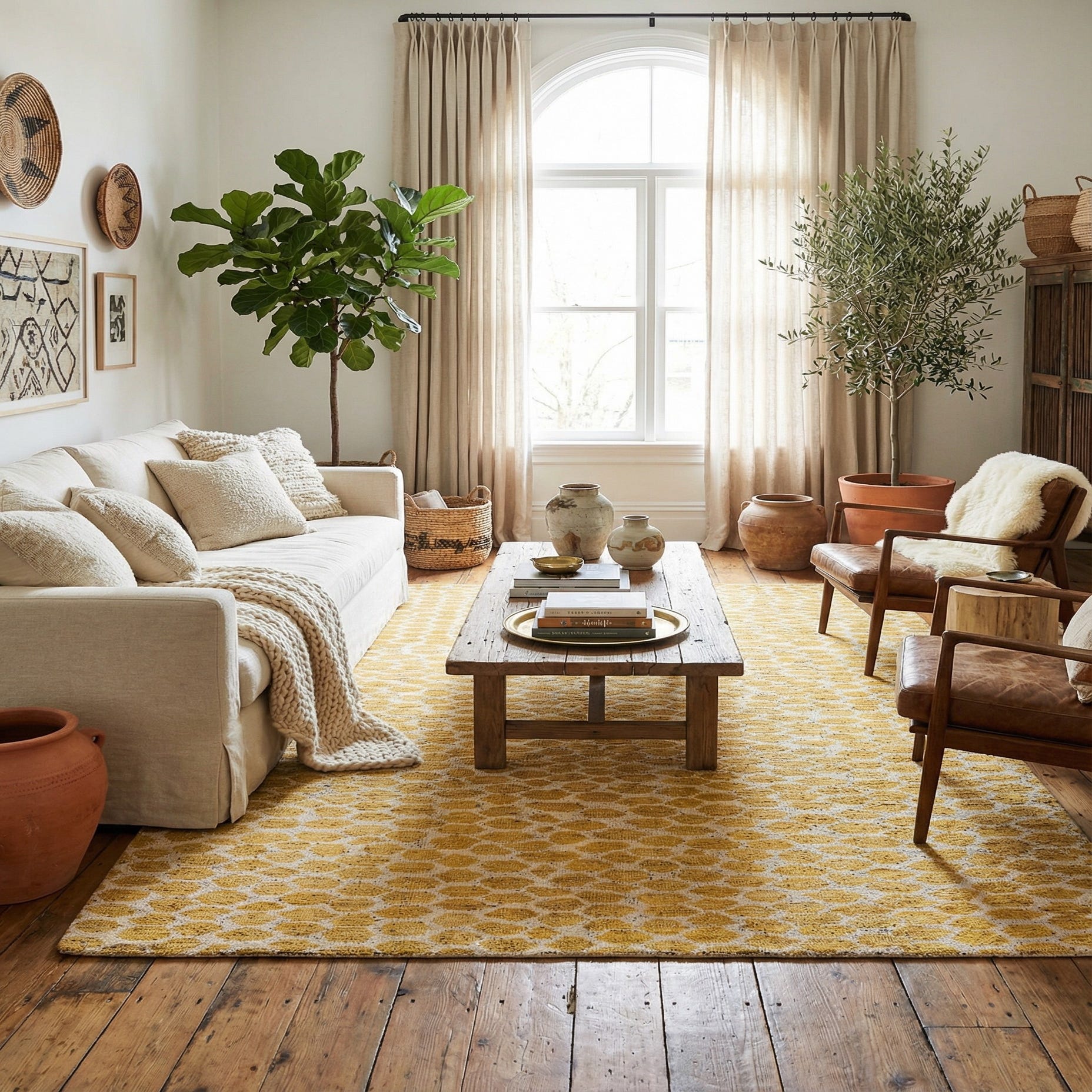 Primary color is Yellow. Colors in this rug include: Yellow, Ivory.