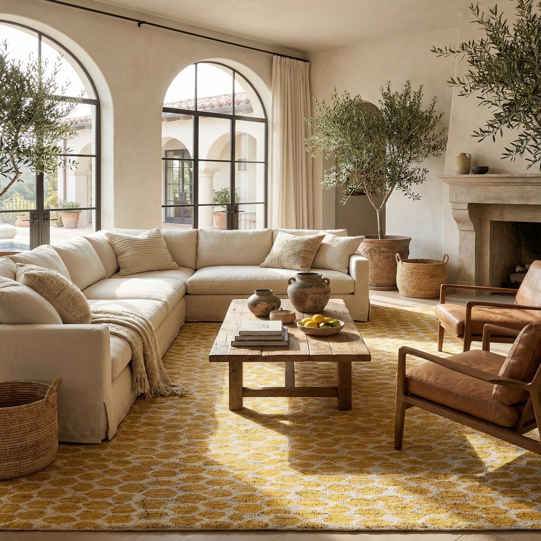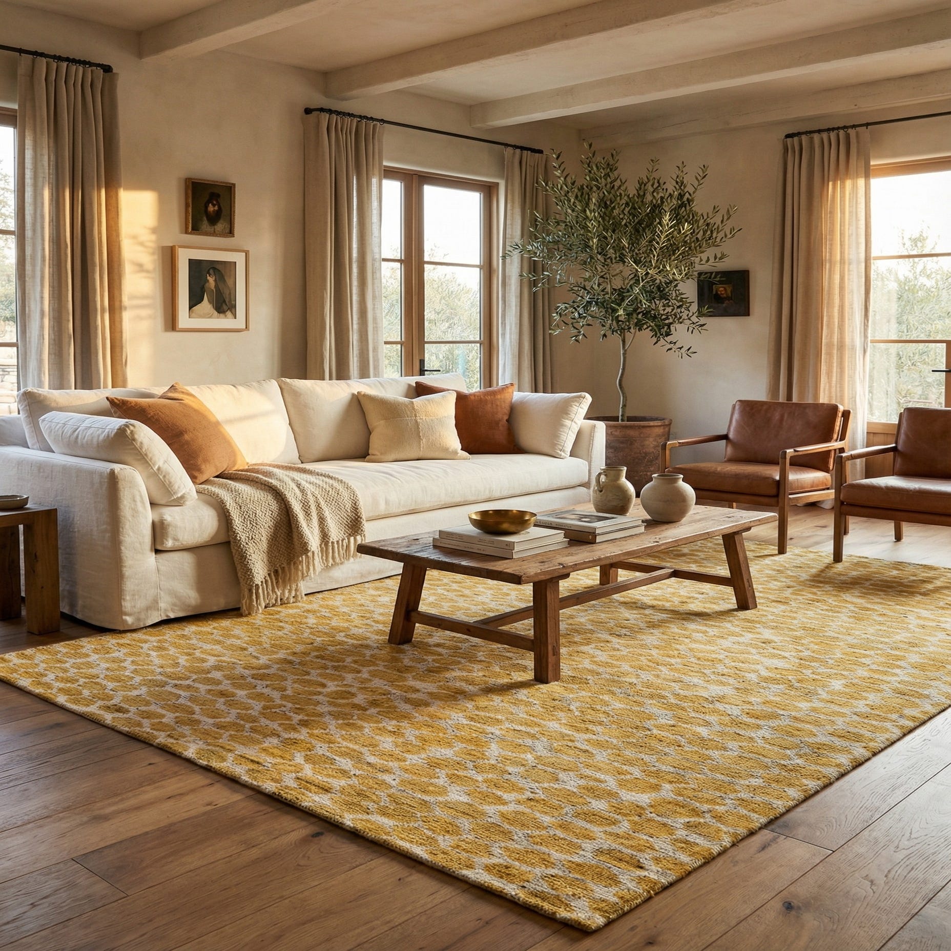 Primary color is Yellow. Colors in this rug include: Yellow, Ivory.