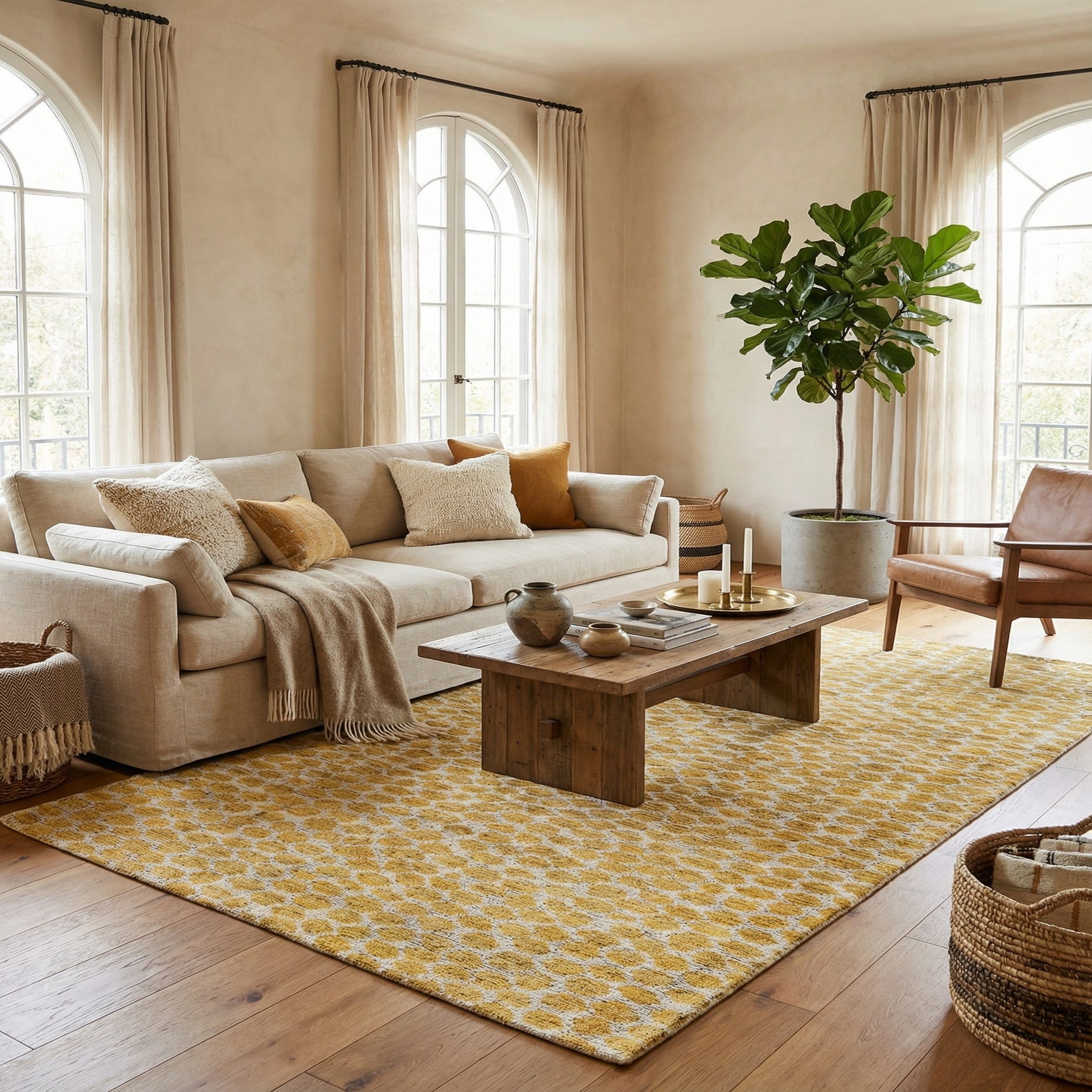 Primary color is Yellow. Colors in this rug include: Yellow, Ivory.
