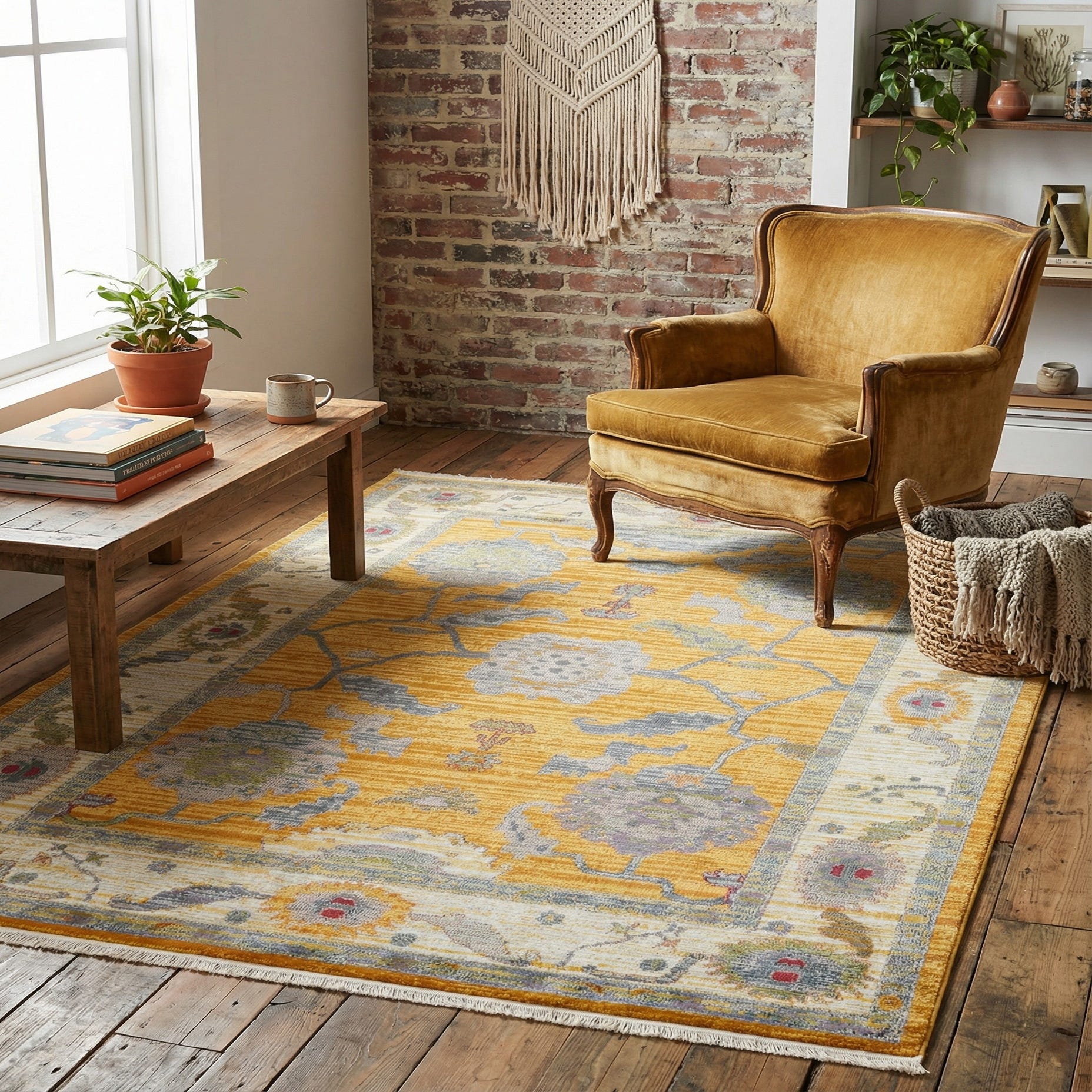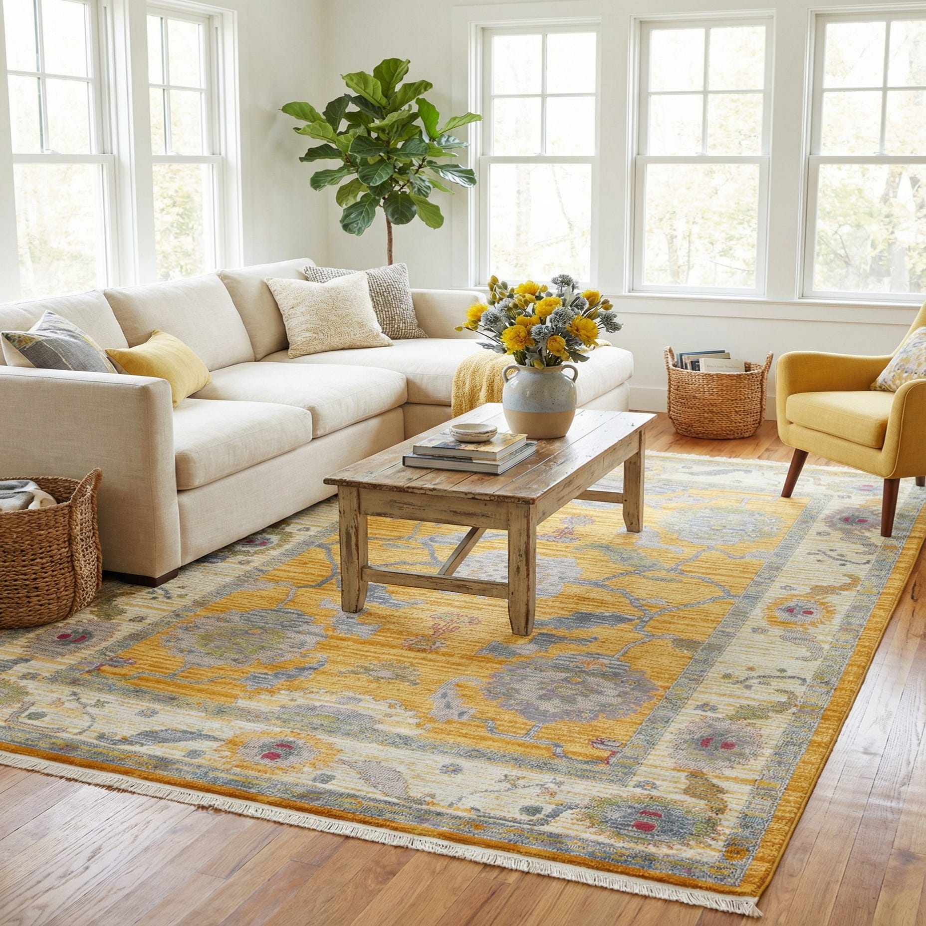 Primary color is Yellow. Colors in this rug include: Yellow, Blue, Gray, Green, Ivory, Orange, Light Blue, Pink.
