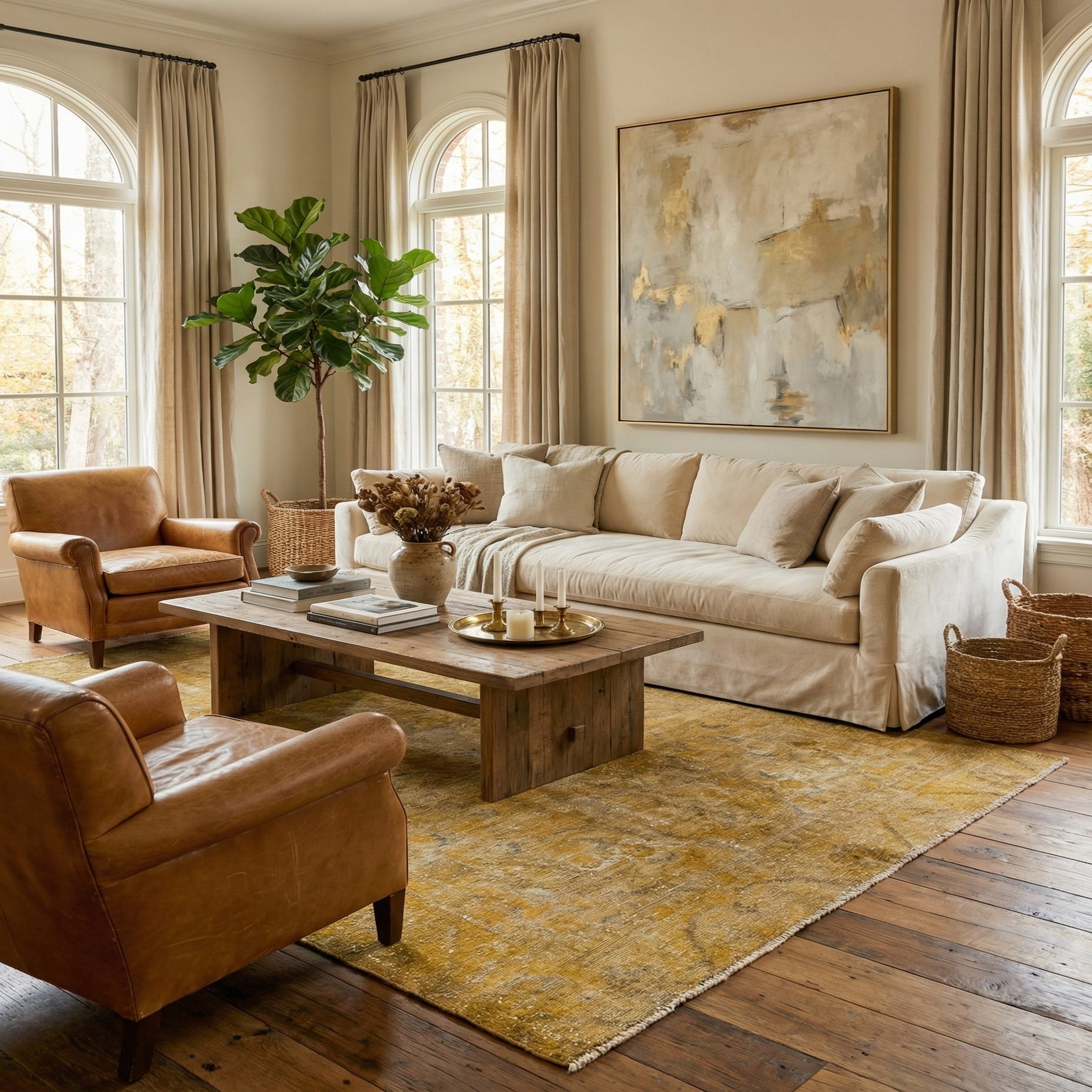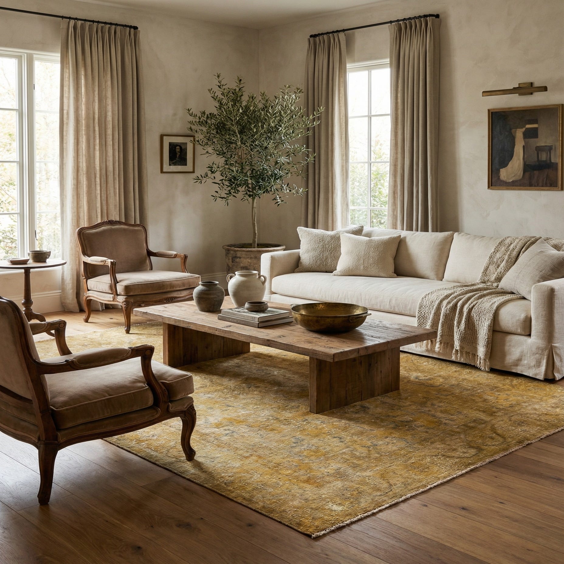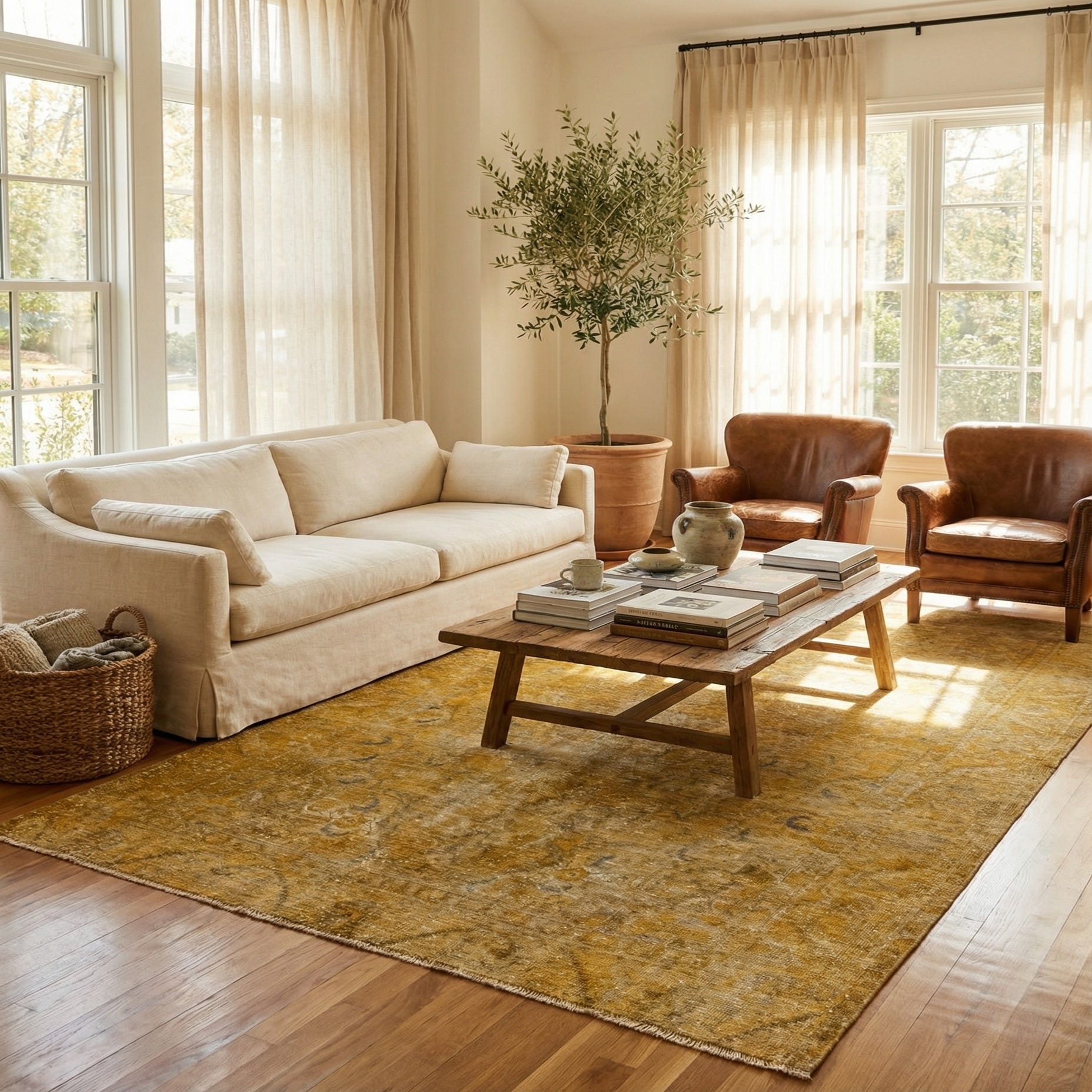 Primary color is Yellow. Colors in this rug include: Yellow, Brown, Ivory.