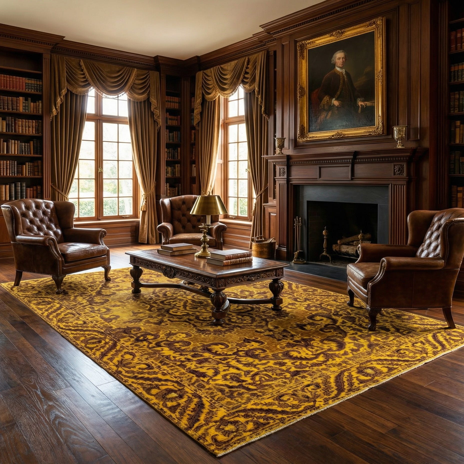 Primary color is yellow. Colors in this rug include: yellow, Brown.