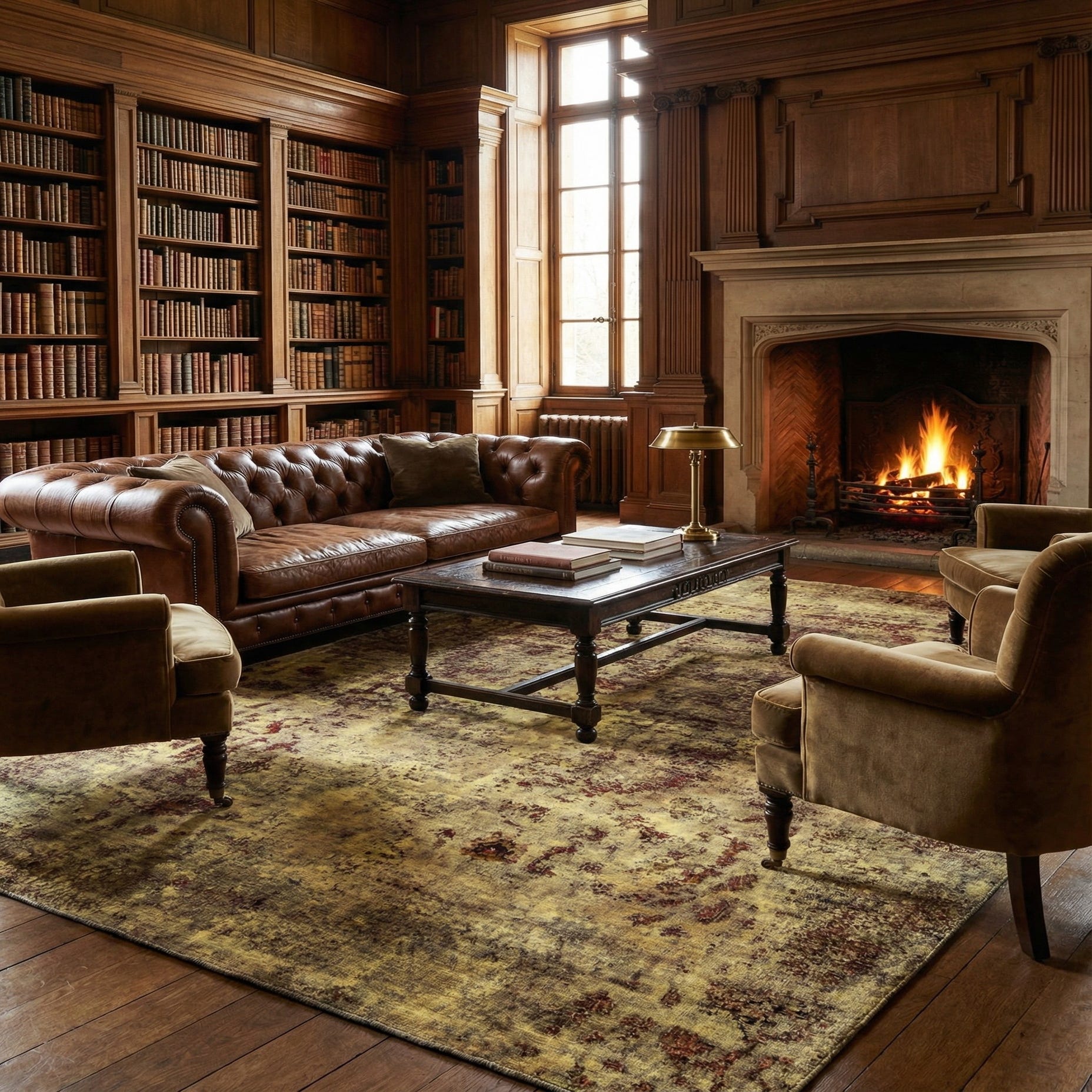 Primary color is yellow. Colors in this rug include: yellow, Brown.