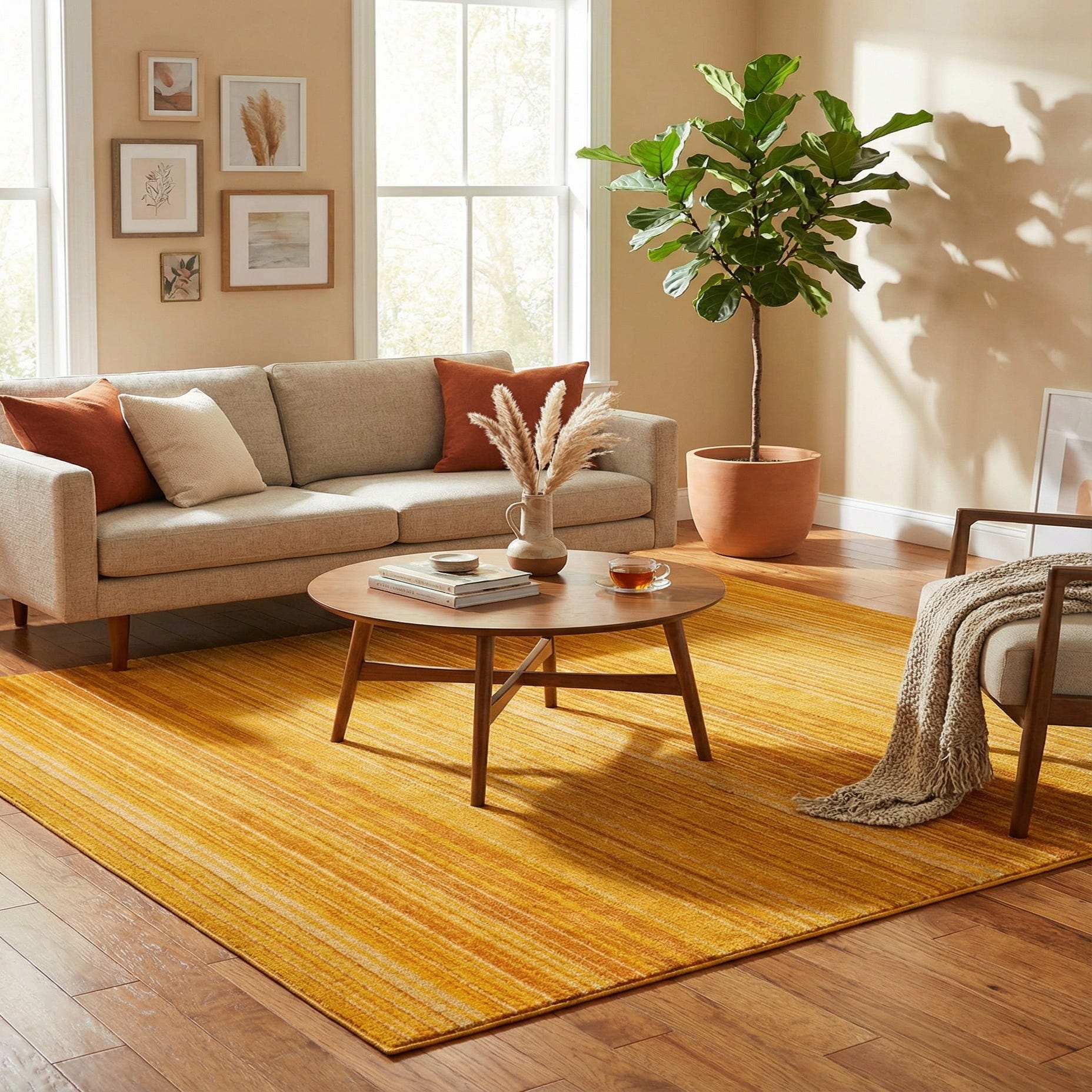 Primary color is Yellow. Colors in this rug include: Yellow, Orange.