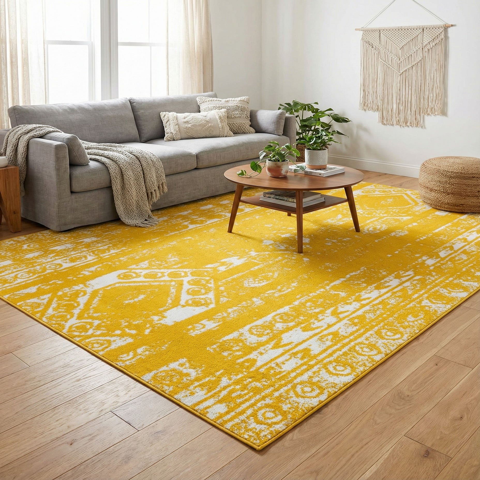 Primary color is Yellow. Colors in this rug include: Yellow, Ivory.